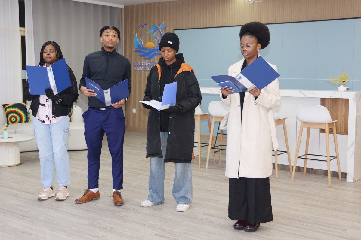 在加勒比地區(qū)研究中心,來自牙買加、海地等4位留學(xué)生代表表演了中文詩朗誦,并與代表團進行了親切友好的交流。