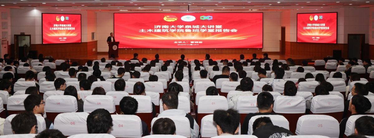 11月15日,土木建筑學(xué)院舉辦濟(jì)南大學(xué)泉城大講堂暨魯班學(xué)堂報(bào)告會(huì),濟(jì)南建工集團(tuán)黨委書(shū)記、董事長(zhǎng)曹曉巖來(lái)校作報(bào)告。濟(jì)南建工集團(tuán)有限公司綜合辦公室主任暢佳佳,濟(jì)南建工集團(tuán)有限公司人力資源部部長(zhǎng)范宗宇,濟(jì)南建工集團(tuán)有限公司產(chǎn)業(yè)發(fā)展部副部長(zhǎng)張中堃等集團(tuán)相關(guān)部門(mén)負(fù)責(zé)人,濟(jì)南大學(xué)黨委副書(shū)記、校長(zhǎng)劉宗明,土木建筑學(xué)院領(lǐng)導(dǎo)班子及師生代表等400余人參加活動(dòng)。報(bào)告會(huì)由土木建筑學(xué)院黨委副書(shū)記、院長(zhǎng)謝群主持。