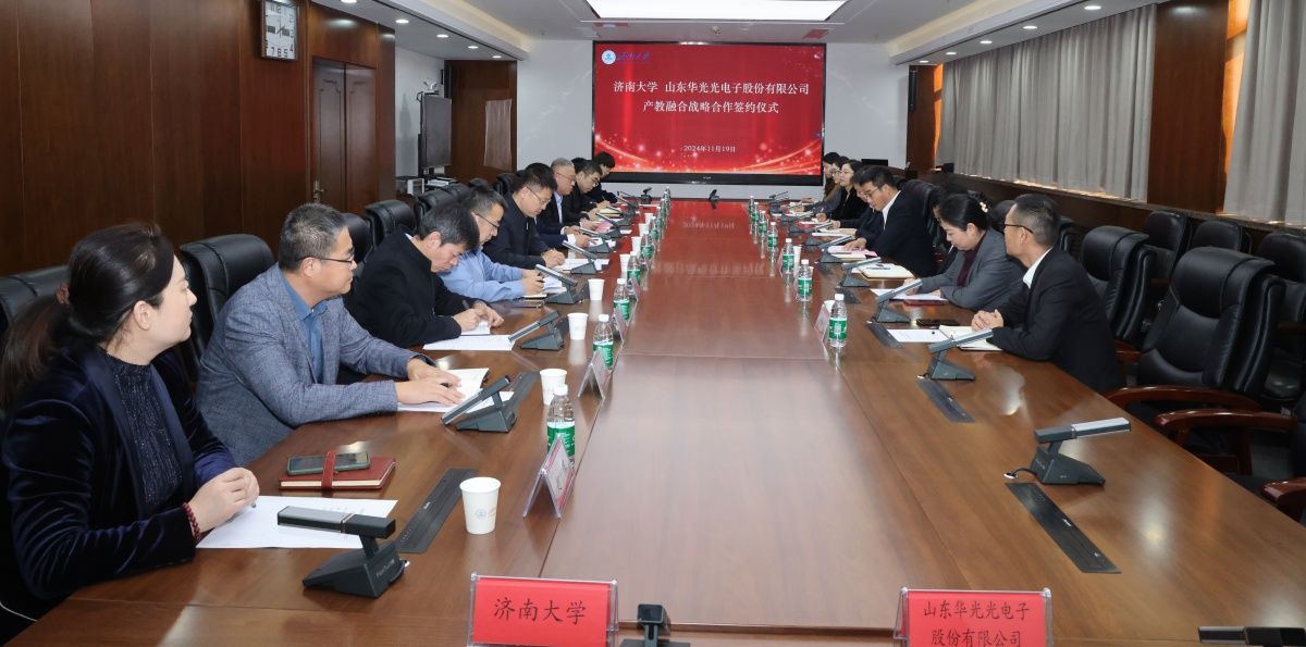 11月19日,學(xué)校與山東華光光電子股份有限公司產(chǎn)教融合戰(zhàn)略合作簽約儀式在學(xué)校第一會(huì)議室舉行。學(xué)校黨委副書(shū)記、校長(zhǎng)劉宗明,黨委常委、副校長(zhǎng)黃加棟,山東華光光電子股份有限公司黨委書(shū)記、董事長(zhǎng)吳德華,黨委委員、副總經(jīng)理杜軍軍出席簽約儀式。山東華光光電子股份有限公司技術(shù)研發(fā)部、人力資源部、綜合管理部、融合業(yè)務(wù)部,學(xué)校合作發(fā)展處、教務(wù)處、科技處、材料科學(xué)與工程學(xué)院、物理科學(xué)與技術(shù)學(xué)院相關(guān)負(fù)責(zé)同志參加活動(dòng),簽約儀式由黃加棟主持。