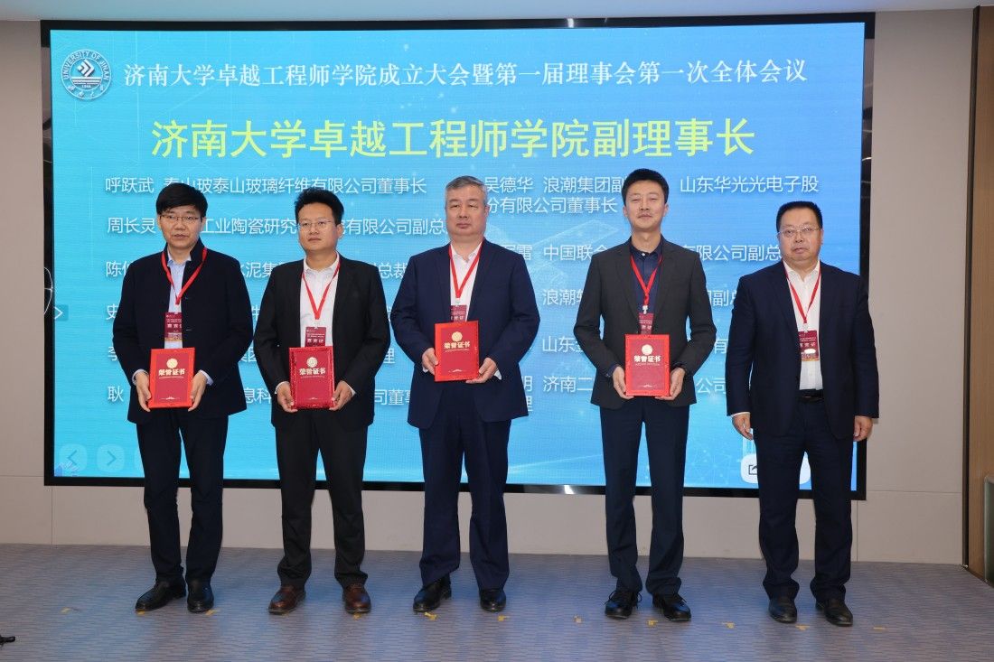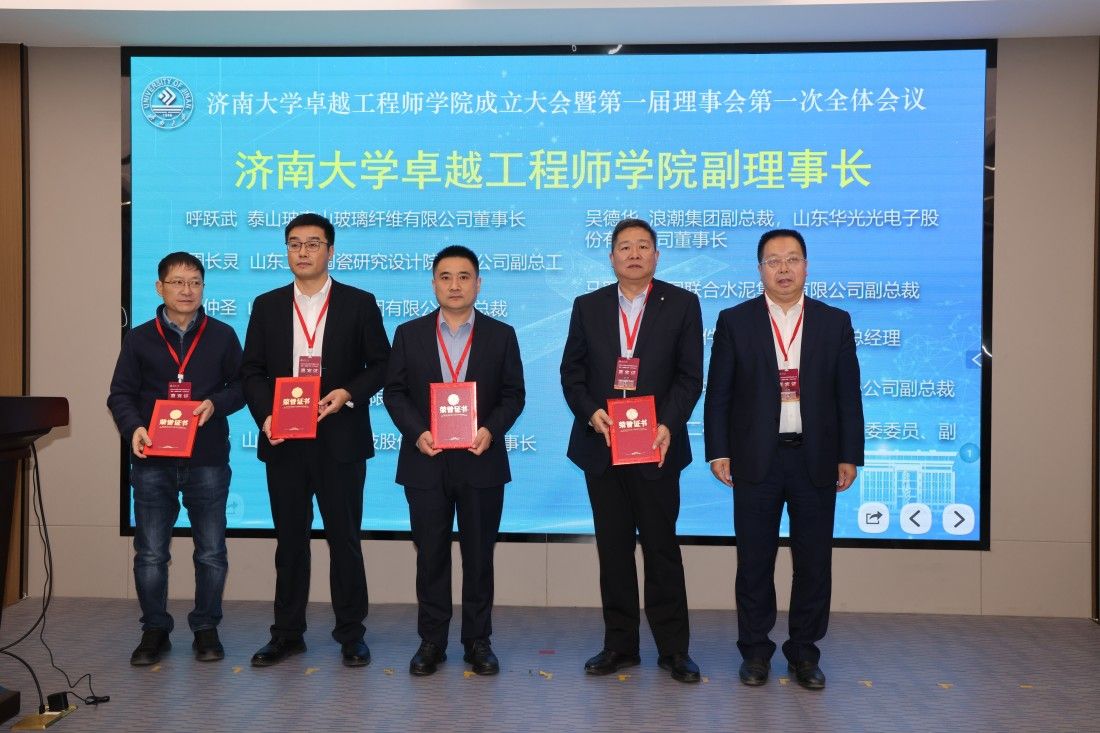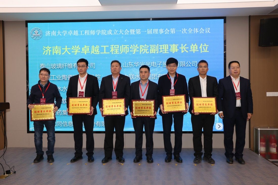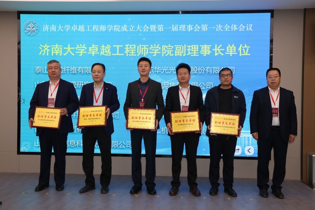 會上,濟南大學卓越工程師學院理事會理事長、濟南大學校長劉宗明、副理事長代表泰山玻璃纖維有限公司董事長呼躍武共同為濟南大學卓越工程師學院揭牌。