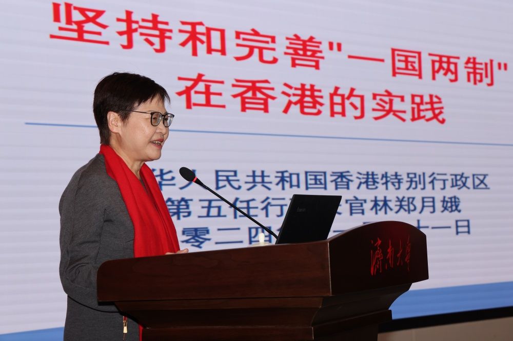 林鄭月娥女士以“堅(jiān)持和完善‘一國(guó)兩制’在香港的實(shí)踐”作主旨演講,劉春華主持演講會(huì)。林鄭月娥女士回顧了香港特區(qū)的歷史發(fā)展和“一國(guó)兩制”的制度背景,介紹了香港特區(qū)的憲制秩序、特區(qū)基本法、特區(qū)行政長(zhǎng)官的憲制地位,特區(qū)人才優(yōu)勢(shì)以及吸引海內(nèi)外人才的措施,并針對(duì)堅(jiān)持和完善“一國(guó)兩制”實(shí)踐、打造人才聚集高地等展開(kāi)講解。她講到,“一國(guó)兩制”是中國(guó)特色社會(huì)主義的偉大創(chuàng)舉,是香港保持長(zhǎng)期繁榮穩(wěn)定的最佳制度安排。在中央的支持下,香港正邁向由治及興的新征程,更應(yīng)把握機(jī)遇,背靠祖國(guó)、面向世界,發(fā)揮自身獨(dú)特優(yōu)勢(shì),提升經(jīng)濟(jì)動(dòng)力,積極發(fā)展新產(chǎn)業(yè),拓展國(guó)際及內(nèi)地的聯(lián)系,提高香港樞紐地位。