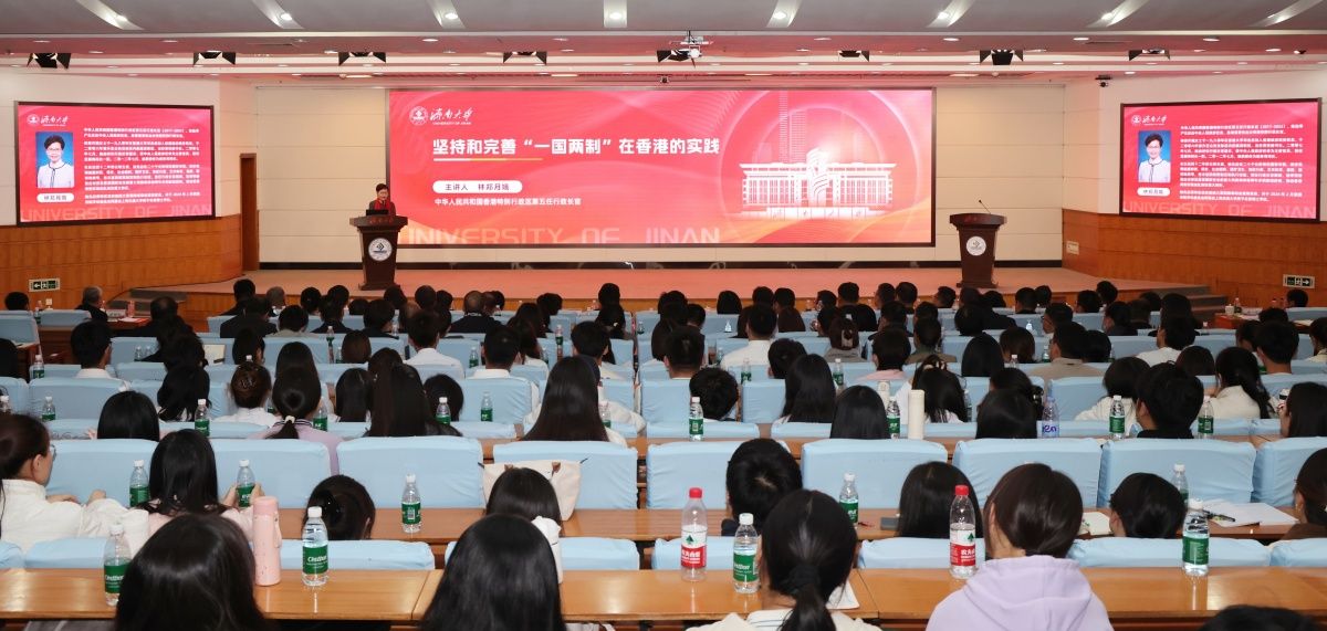 山東省港澳辦、濟(jì)南市港澳辦、學(xué)校黨委副書(shū)記商華,黨委常委、紀(jì)委書(shū)記、省監(jiān)委駐濟(jì)南大學(xué)監(jiān)察專(zhuān)員續(xù)鐵,黨委常委、副校長(zhǎng)王霞,黨委常委、副校長(zhǎng)李強(qiáng),黨委常委、副校長(zhǎng)黃加棟,副校長(zhǎng)徐征和,黨委常委、組織部部長(zhǎng)滕晉,黨委常委、統(tǒng)戰(zhàn)部部長(zhǎng)、臺(tái)港澳事務(wù)辦公室主任徐慶國(guó),學(xué)校各二級(jí)單位黨委書(shū)記、各部門(mén)負(fù)責(zé)人、各學(xué)院分管學(xué)生工作副書(shū)記以及師生代表共350余人聆聽(tīng)了演講。