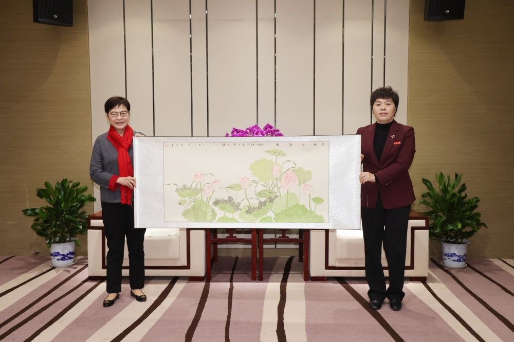 座談會(huì)上,劉春華代表學(xué)校向林鄭月娥女士贈(zèng)送了我校美術(shù)與設(shè)計(jì)學(xué)院青年教師的國(guó)畫(huà)作品《荷風(fēng)清幽圖》。
