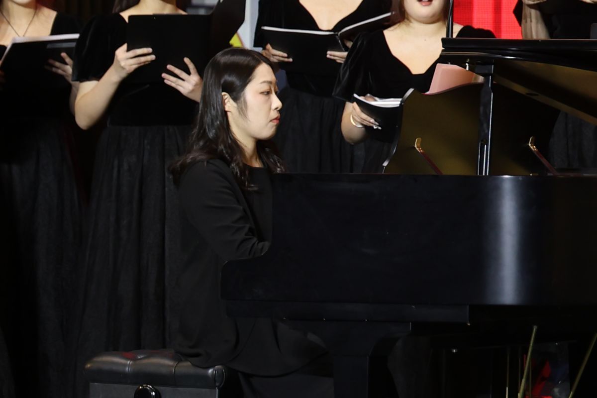 晚會在旋律悠揚的歌曲《思念》中拉開序幕,深情細膩的演唱將觀眾帶入過往歲月的美好回憶中。上半場由濟南大學(xué)音樂學(xué)院山東泉城合唱團擔(dān)綱演出。中國古詩詞藝術(shù)歌曲《越人歌》,展現(xiàn)出詩詞韻律與音樂節(jié)奏的完美融合,婉轉(zhuǎn)沉靜、層次豐富的演唱傳達出中國傳統(tǒng)文化深厚的底蘊和獨特的價值;濃郁的夏季在合唱《夏天的夢是什么顏色的呢》歌聲中鋪展開來,陽光盡灑、溫柔細膩;歌曲《如果明天就是下一生》抒發(fā)出真摯情感,讓人不禁自問,今天當(dāng)如何度過;歌曲《亞細亞》《帕米爾風(fēng)情》將民族元素、交響元素巧妙地融合在一起,既富有動感,又從容大氣,將亞洲各國山水相依、民心相通和大美新疆的壯闊畫卷鋪陳開來;經(jīng)典紅色曲目《因為信仰》《唱支山歌給黨聽》《愛永在》以鏗鏘昂揚的曲調(diào)和飽滿深情的演唱將觀眾的思緒帶回波瀾壯闊的奮斗歷程,唱出了對新中國成立75周年的赤誠禮贊。