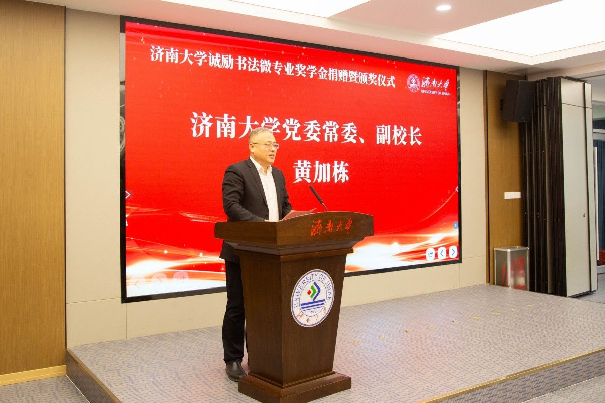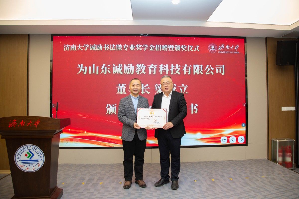 12月27日,濟南大學(xué)誠勵書法微專業(yè)獎學(xué)金捐贈暨頒獎儀式在學(xué)校第五報告廳舉行。濟南大學(xué)黨委常委、副校長黃加棟,山東誠勵教育科技有限公司董事長梁成立出席儀式,學(xué)校黨委學(xué)生工作部(處)、教務(wù)處、合作發(fā)展處、團委、美術(shù)與設(shè)計學(xué)院、山東誠勵教育科技有限公司相關(guān)負(fù)責(zé)人以及師生代表參加活動。