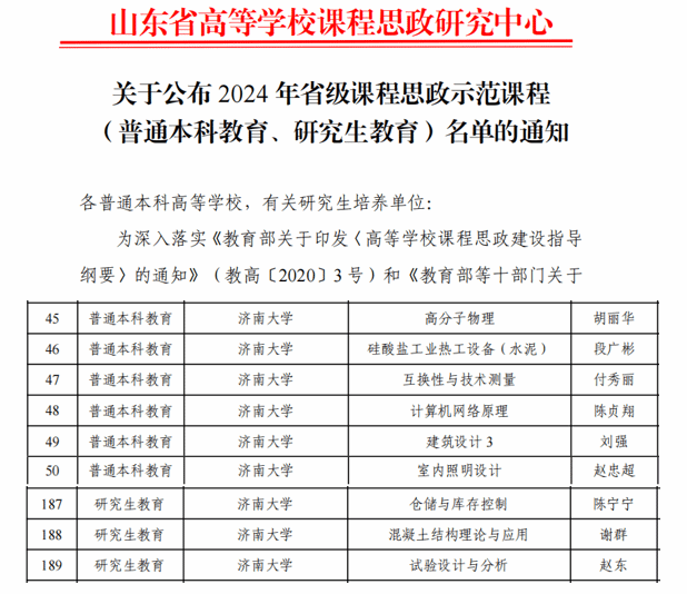 近日,2024年山東省高校課程思政示范課程名單公布。濟(jì)南大學(xué)9門課程入選,其中本科課程6 門、研究生課程3門。截至目前,學(xué)校省級(jí)課程思政示范課程累計(jì)達(dá)到32 門。