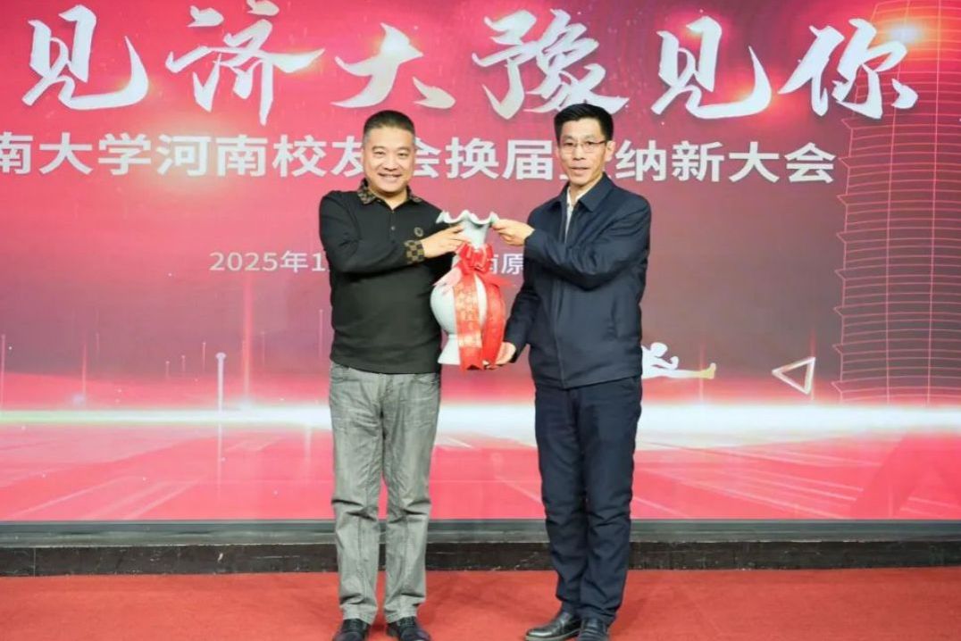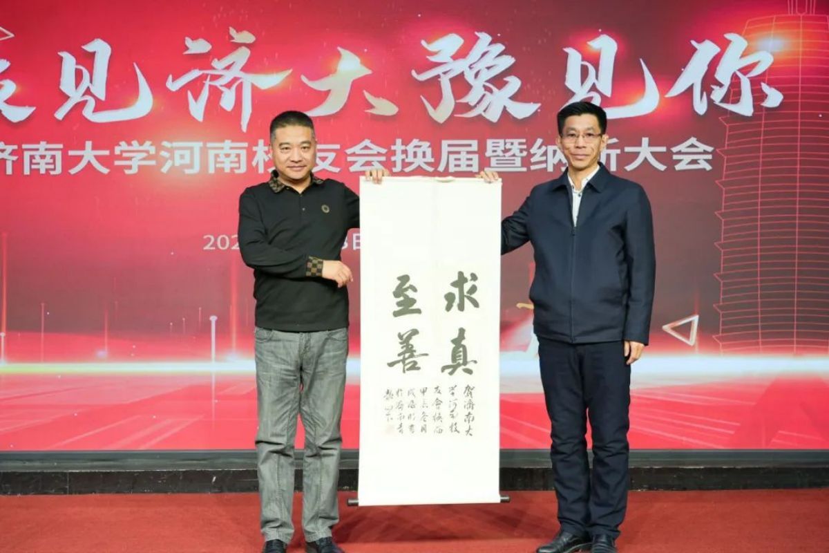 會上,李強代表學校向河南校友會贈送書法作品表示祝賀,楊德柱代表河南校友會向母?;刭浫甏珊煽谄?。