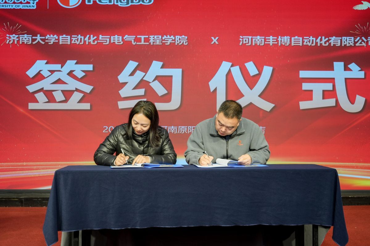 豐博計量集團有限公司相關(guān)人員向與會校友們介紹了豐博集團與濟南大學校企合作發(fā)展情況。濟南大學自動化與電氣工程學院與河南豐博自動化有限公司就職工培訓基地、教學實踐基地、人才培養(yǎng)及專家?guī)旖ㄔO(shè)簽訂合作協(xié)議。