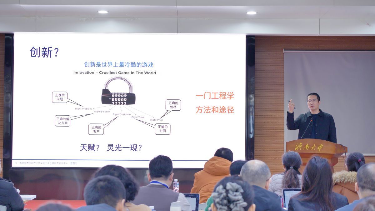 曹國(guó)忠詳細(xì)介紹了本次培訓(xùn)的安排及目標(biāo)。他表示,TRIZ創(chuàng)新方法作為系統(tǒng)化的科學(xué)方法論,能夠有效提升教師的創(chuàng)新思維與教學(xué)能力,幫助學(xué)生解決復(fù)雜工程問(wèn)題。本次培訓(xùn)持續(xù)三至四個(gè)月時(shí)間,將通過(guò)理論講授、案例研討與項(xiàng)目實(shí)戰(zhàn)相結(jié)合的方式,促進(jìn)創(chuàng)新教育與學(xué)科教學(xué)深度融合,幫助教師掌握創(chuàng)新方法核心工具,實(shí)現(xiàn)從專業(yè)教師向創(chuàng)新培訓(xùn)師角色的轉(zhuǎn)變和躍升。他指出,TRIZ方法不僅適用于工程技術(shù)領(lǐng)域,還可廣泛應(yīng)用于管理、教育等多個(gè)領(lǐng)域,參訓(xùn)教師應(yīng)積極探索跨學(xué)科應(yīng)用,內(nèi)化于心、外化于行,推動(dòng)創(chuàng)新方法的普及與深化,助力打造學(xué)校雙創(chuàng)教育特色品牌。