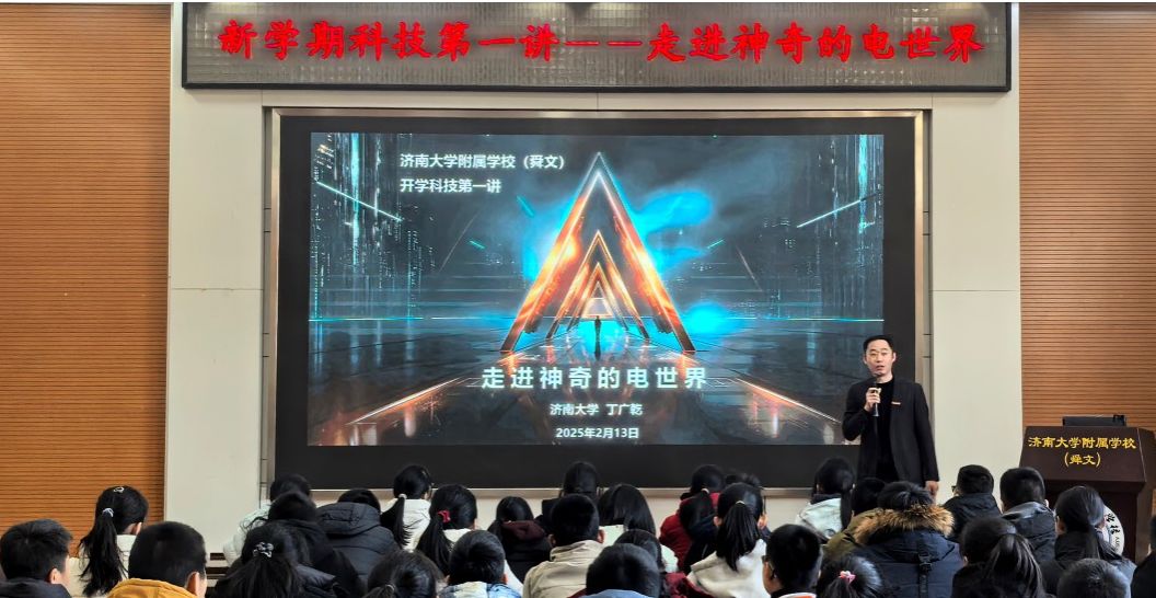 儀式結(jié)束后,相關(guān)領(lǐng)導(dǎo)和來賓共同參觀了學(xué)生寒假作品展示和科技主題展。濟南大學(xué)自動化與電氣工程學(xué)院丁廣乾副教授為學(xué)生開展新學(xué)期科技第一課,帶領(lǐng)學(xué)生一起探索神奇的電世界,了解電的基本原理、應(yīng)用以及如何改變我們的世界。