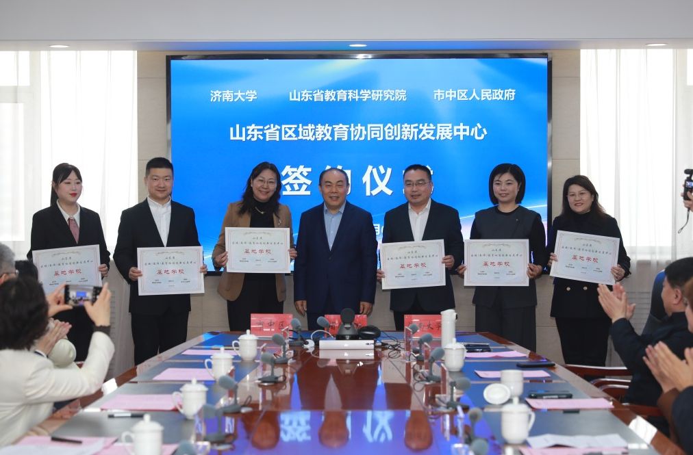 儀式上,山東省教育科學(xué)研究院副院長(zhǎng)張斌為“山東省區(qū)域(教師)教育協(xié)調(diào)創(chuàng)新發(fā)展中心基地學(xué)?!贝眍C發(fā)了證書,濟(jì)南大學(xué)附屬學(xué)校(舜文)校長(zhǎng)金華作為基地學(xué)校代表進(jìn)行了發(fā)言。