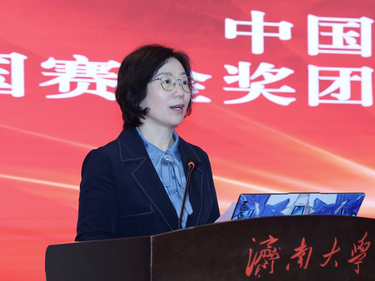 王霞對(duì)魏光祥一行的到來(lái)表示歡迎,對(duì)金獎(jiǎng)團(tuán)隊(duì)表示祝賀。她指出,濟(jì)南大學(xué)始終將創(chuàng)新創(chuàng)業(yè)教育作為落實(shí)立德樹(shù)人根本任務(wù)的關(guān)鍵抓手。她強(qiáng)調(diào),新時(shí)代創(chuàng)新創(chuàng)業(yè)人才培養(yǎng)既要與思想政治教育同頻共振,也要與黨建工作協(xié)同驅(qū)動(dòng)。針對(duì)未來(lái)建設(shè)路徑,她提出了三點(diǎn)方向:一是厚植創(chuàng)新文化沃土,通過(guò)全媒體矩陣宣傳大賽內(nèi)涵,打造“濟(jì)大創(chuàng)客”品牌,讓崇尚創(chuàng)新成為校園新風(fēng)尚。二是鍛造能力進(jìn)階體系,深化“課程-項(xiàng)目-競(jìng)賽”進(jìn)階式培養(yǎng)模式,全面激活師生創(chuàng)新潛能。三是服務(wù)國(guó)家戰(zhàn)略需求,加強(qiáng)拔尖創(chuàng)新人才培養(yǎng),推動(dòng)產(chǎn)學(xué)研用深度融合,培育具有國(guó)際競(jìng)爭(zhēng)力的創(chuàng)新成果。她希望各學(xué)院院長(zhǎng)能夠高度重視,結(jié)合學(xué)科建設(shè)和博士點(diǎn)精準(zhǔn)培育對(duì)人才培養(yǎng)提出的要求,積極推動(dòng)創(chuàng)新創(chuàng)業(yè)教育與專(zhuān)業(yè)課程深度融合,為學(xué)生參賽提供全方位的支持與保障。同時(shí),她寄語(yǔ)青年學(xué)子要胸懷“國(guó)之大者”,敢為人先,勇立潮頭,腳踏實(shí)地,在各自熱愛(ài)的領(lǐng)域發(fā)光發(fā)熱。