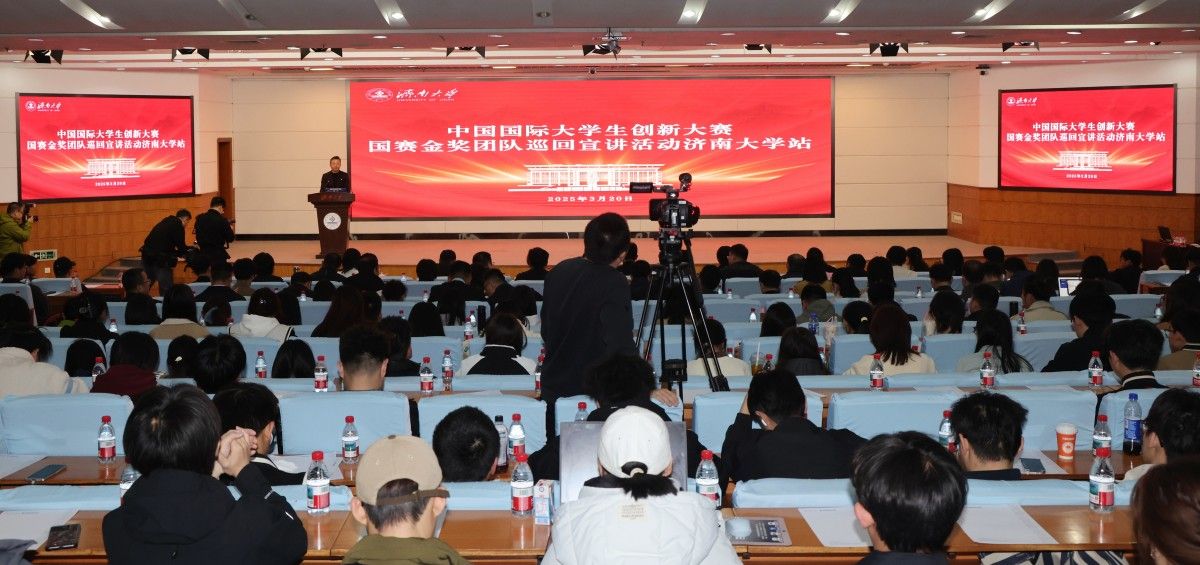 3月20日上午,由山東省教育發(fā)展服務(wù)中心主辦的中國(guó)國(guó)際大學(xué)生創(chuàng)新大賽國(guó)賽金獎(jiǎng)團(tuán)隊(duì)巡回宣講活動(dòng)在我校第一學(xué)術(shù)報(bào)告廳舉行。山東省教育發(fā)展服務(wù)中心黨委書(shū)記、主任魏光祥,濟(jì)南大學(xué)黨委常委、副校長(zhǎng)王霞出席活動(dòng)并講話(huà)。省教育發(fā)展服務(wù)中心有關(guān)負(fù)責(zé)人,齊魯工業(yè)大學(xué)(山東省科學(xué)院)、山東農(nóng)業(yè)大學(xué)金獎(jiǎng)團(tuán)隊(duì),濟(jì)南大學(xué)各教學(xué)學(xué)院院長(zhǎng),分管學(xué)生工作的黨委副書(shū)記、副院長(zhǎng),全體團(tuán)干部和師生代表共300余人參加活動(dòng)。宣講活動(dòng)由濟(jì)南大學(xué)團(tuán)委書(shū)記胡春毅主持。
