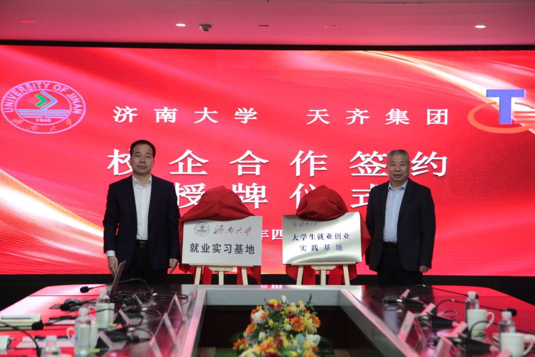 在山東天齊置業(yè)集團(tuán)股份有限公司,集團(tuán)董事、總經(jīng)理呂茂森介紹了企業(yè)發(fā)展概況,并感謝學(xué)校源源不斷地為企業(yè)輸送高質(zhì)量畢業(yè)生,他對(duì)我校人才培養(yǎng)質(zhì)量給予高度評(píng)價(jià),表示已有一大批濟(jì)大畢業(yè)生成長(zhǎng)為企業(yè)骨干力量。劉振亮、謝東峰等優(yōu)秀校友作了發(fā)言,表達(dá)了對(duì)母校和企業(yè)的感恩。徐征和在致辭中介紹了學(xué)校學(xué)科建設(shè)、人才培養(yǎng)及科研創(chuàng)新成果,對(duì)天齊集團(tuán)長(zhǎng)期以來(lái)對(duì)學(xué)校各項(xiàng)工作的大力支持表達(dá)衷心感謝,他希望以此次交流會(huì)為契機(jī),進(jìn)一步深化校企全方位合作,共同助力畢業(yè)生高質(zhì)量就業(yè)和區(qū)域經(jīng)濟(jì)高質(zhì)量發(fā)展。會(huì)上,校企雙方簽訂了濟(jì)南大學(xué)就業(yè)實(shí)習(xí)基地、濟(jì)南大學(xué)就業(yè)創(chuàng)業(yè)實(shí)踐基地協(xié)議并舉行了揭牌儀式。