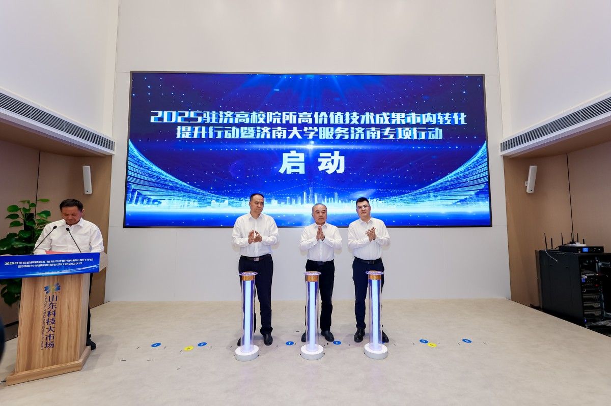 4月23日,由山東省科技廳指導(dǎo),我校與山東省創(chuàng)新發(fā)展研究院、濟(jì)南市科技局等單位聯(lián)合主辦的“2025駐濟(jì)高校院所高價(jià)值技術(shù)成果市內(nèi)轉(zhuǎn)化提升行動(dòng)暨濟(jì)南大學(xué)服務(wù)濟(jì)南專項(xiàng)行動(dòng)啟動(dòng)儀式”在山東科技大市場舉行。山東省科技廳二級巡視員王寶立,濟(jì)南大學(xué)黨委副書記張慶國,山東省科學(xué)技術(shù)廳成果轉(zhuǎn)化與區(qū)域創(chuàng)新處處長張延誠,濟(jì)南市科技局黨組成員、副局長呂家亮,市中區(qū)副區(qū)長王瑩,市中區(qū)科技局黨組書記劉文濤出席活動(dòng)。來自駐濟(jì)高校院所、企業(yè)等100余位代表參加本次活動(dòng)。啟動(dòng)儀式由市科技局總工程師、一級調(diào)研員張根生主持。