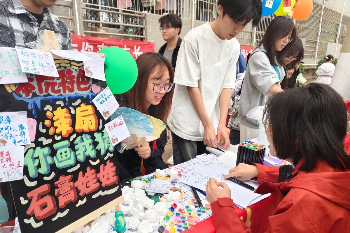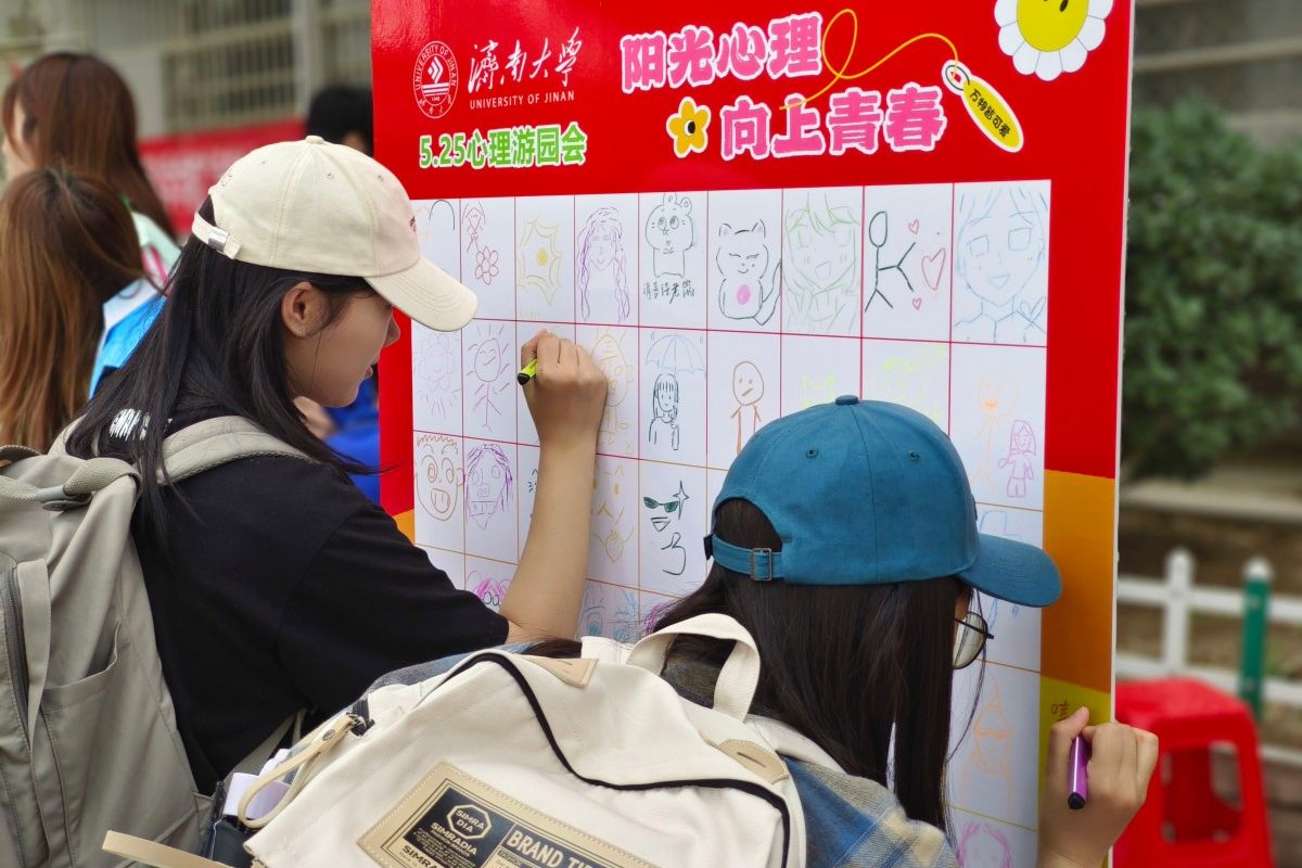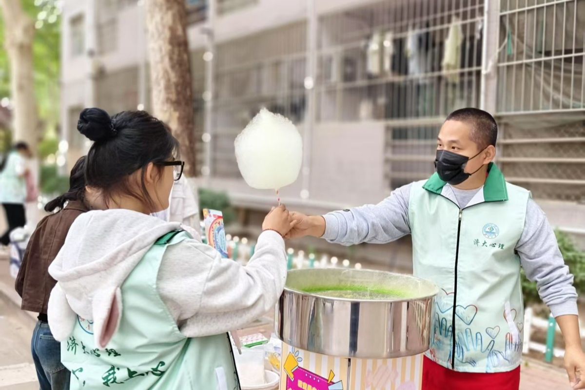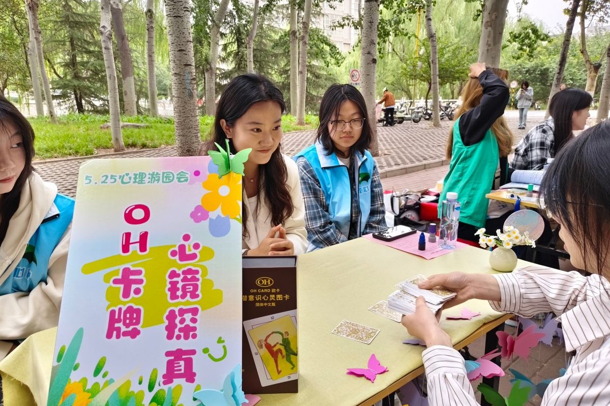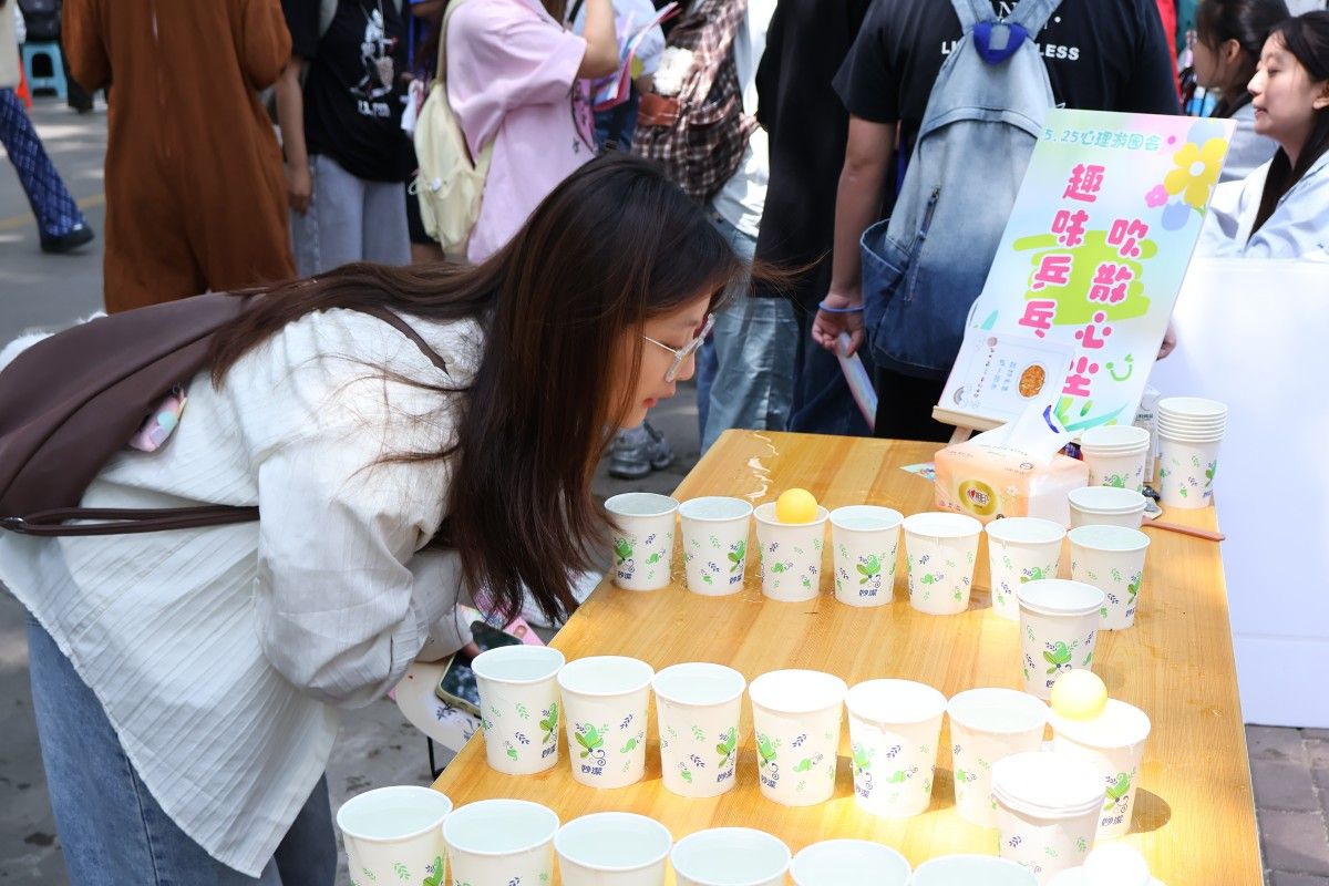 心理游園會(huì)以陽(yáng)光心理為核心理念,設(shè)置“知心區(qū)”“潤(rùn)心區(qū)”“動(dòng)心區(qū)”“可心區(qū)”“甜心區(qū)”“悅心區(qū)”六大活動(dòng)區(qū)域,通過(guò)心理義診、運(yùn)動(dòng)減壓、藝術(shù)療愈、知識(shí)問(wèn)答、朋輩輔導(dǎo)、心理測(cè)評(píng)、個(gè)體咨詢(xún)和團(tuán)體輔導(dǎo)等多種活動(dòng)形式,引導(dǎo)學(xué)生提升心理素養(yǎng),發(fā)現(xiàn)守護(hù)心靈的N種可能?!爸膮^(qū)”設(shè)置“專(zhuān)家義診,心嶼擺渡”活動(dòng),邀請(qǐng)濟(jì)南市精神衛(wèi)生中心心理專(zhuān)家開(kāi)展心理義診?!皾?rùn)心區(qū)”設(shè)置“OH 卡牌,心鏡探真”“測(cè)評(píng)咨詢(xún),心域?qū)Ш健薄芭筝呡o導(dǎo),心語(yǔ)共聆”活動(dòng),通過(guò)潛意識(shí)探索、心理測(cè)評(píng)、心理輔導(dǎo)幫助學(xué)生認(rèn)識(shí)自我,滋潤(rùn)心靈。“動(dòng)心區(qū)”設(shè)置“趣味乒乓,吹散心塵”“彩繪泥塑,心彩綻放”活動(dòng),通過(guò)運(yùn)動(dòng)療愈、藝術(shù)療愈緩解壓力、放松心情?!疤鹦膮^(qū)”設(shè)置“棉花糖DIY,甜到心里”活動(dòng),通過(guò)手工制作和食物療愈探尋自我關(guān)懷的方式?!皭傂膮^(qū)”設(shè)置“學(xué)院活動(dòng),心靈集市”,各學(xué)院現(xiàn)場(chǎng)開(kāi)展豐富多彩的心理健康活動(dòng)并展示心理月期間品牌活動(dòng)及相關(guān)成果。終點(diǎn)“可心區(qū)”設(shè)置“畫(huà)自畫(huà)像,心繪自觀”“積章套圈,圈住開(kāi)心”活動(dòng),通過(guò)自我描繪、積章套圈,總結(jié)游園活動(dòng),升華育人效果?;顒?dòng)現(xiàn)場(chǎng)氣氛熱烈,趣味十足,持續(xù)吸引數(shù)千余名師生前來(lái)體驗(yàn)。