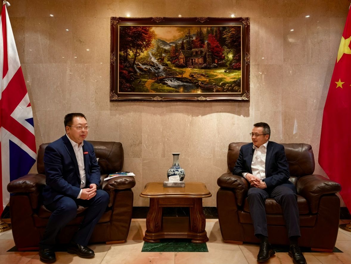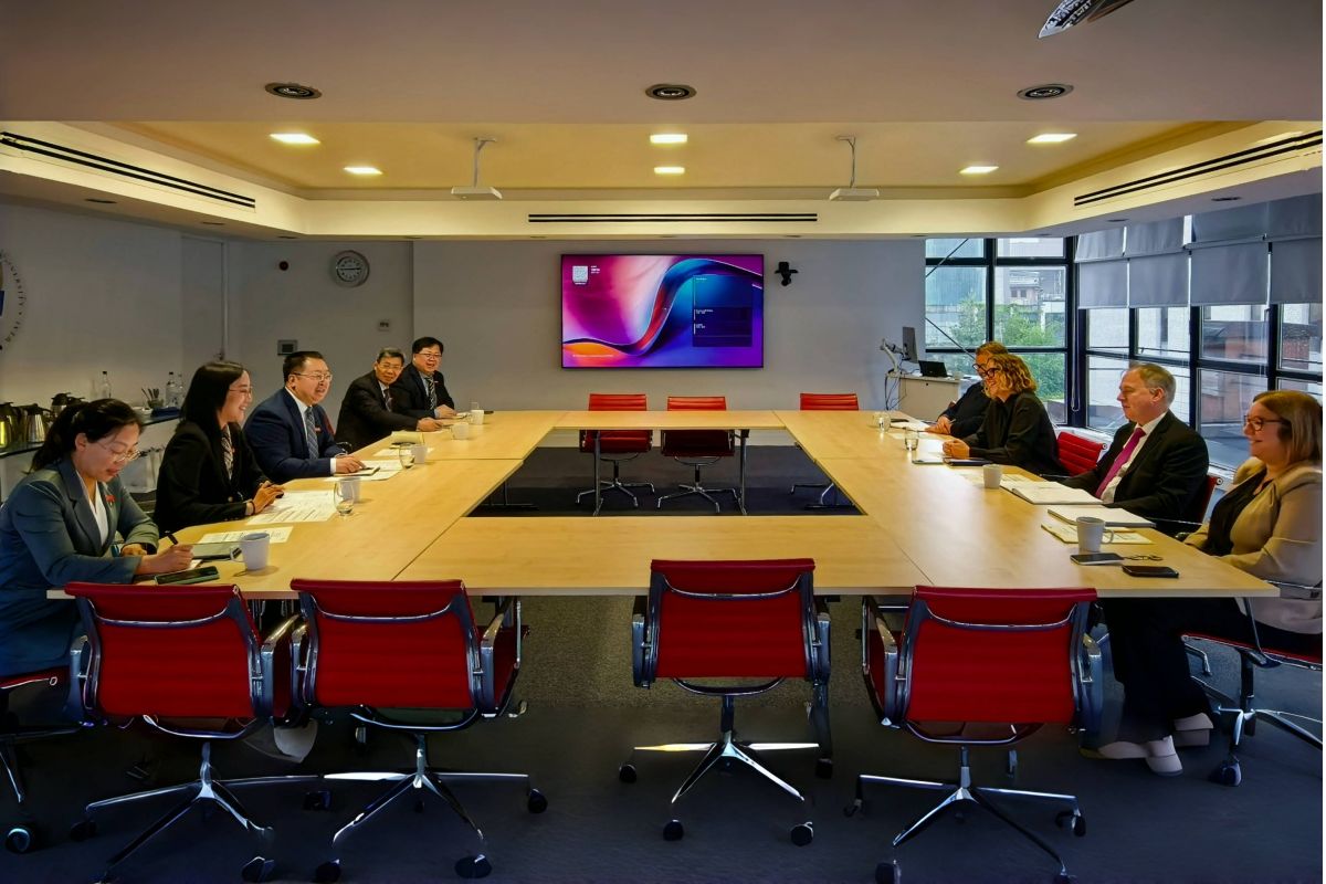 訪問期間,代表團(tuán)拜訪了中國駐愛丁堡總領(lǐng)事館,與張彪總領(lǐng)事座談交流。劉宗明首先介紹了學(xué)校近年事業(yè)發(fā)展及此次訪英情況,他表示學(xué)校重視對英合作,尤其是對蘇格蘭地區(qū)合作,目前學(xué)校已與格拉斯哥加利多尼亞大學(xué)建立深厚合作關(guān)系,希望后續(xù)可以在總領(lǐng)館支持下進(jìn)一步推動與蘇格蘭地區(qū)相關(guān)高校合作。張彪總領(lǐng)事對代表團(tuán)到訪總領(lǐng)館表示歡迎,并介紹了蘇格蘭高等教育及對華合作基本情況,希望學(xué)校能發(fā)揮學(xué)科優(yōu)勢,開拓思路,在合作辦學(xué)、科研合作等領(lǐng)域不斷深化與蘇格蘭地區(qū)高校合作。