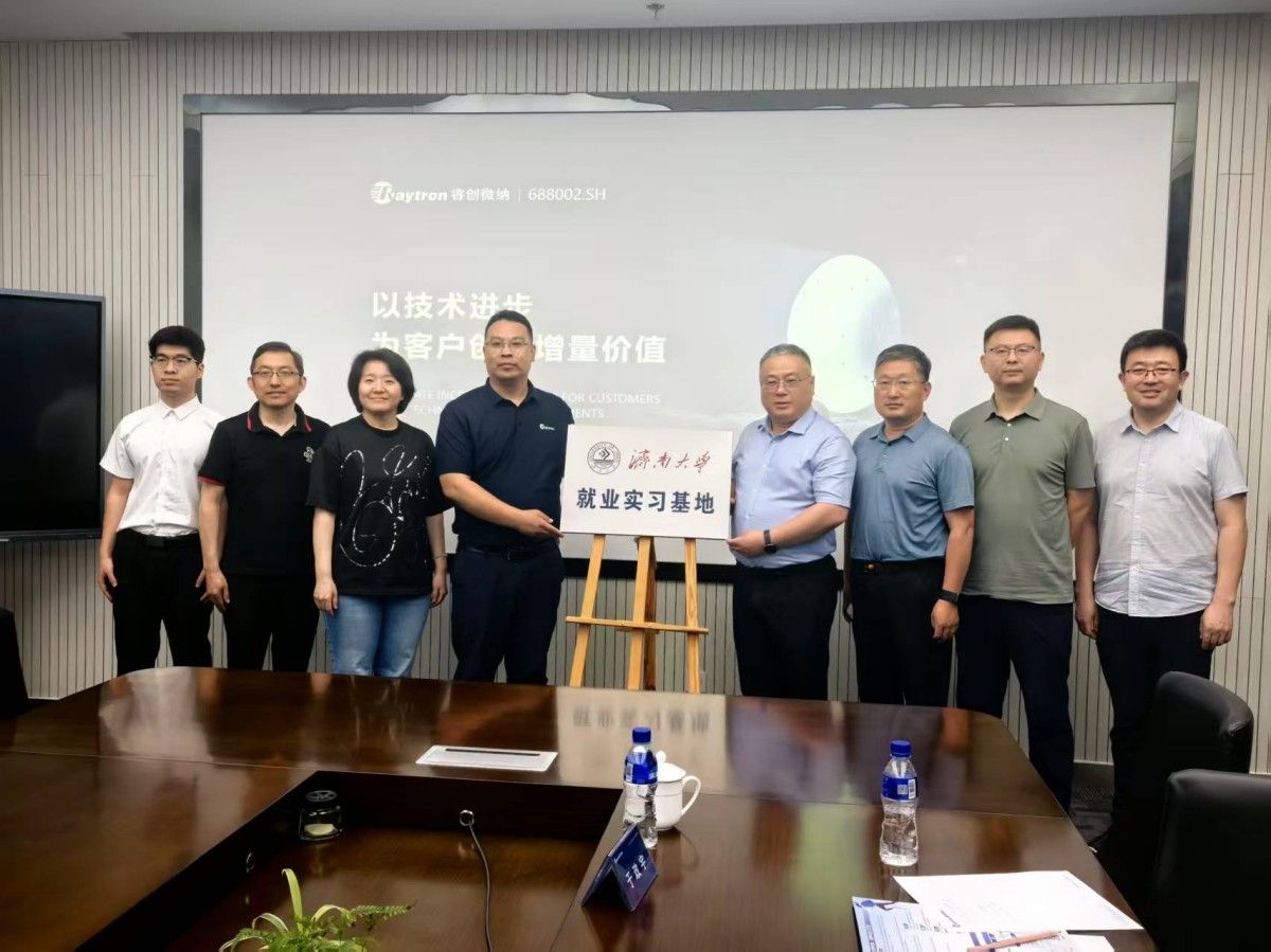 在煙臺(tái),黃加棟一行參觀考察了煙臺(tái)睿創(chuàng)微納技術(shù)股份有限公司在紅外等多維感知技術(shù)領(lǐng)域的系列產(chǎn)品。座談會(huì)上,雙方聚焦光電感知領(lǐng)域的技術(shù)瓶頸與發(fā)展趨勢(shì)進(jìn)行深入交流,就共建就業(yè)實(shí)習(xí)基地、聯(lián)合開(kāi)展人才培養(yǎng)、共同申報(bào)科技項(xiàng)目等達(dá)成合作意向。黃加棟與煙臺(tái)睿創(chuàng)微納技術(shù)股份有限公司發(fā)展部總監(jiān)劉強(qiáng)共同為“濟(jì)南大學(xué)就業(yè)實(shí)習(xí)基地”揭牌。
