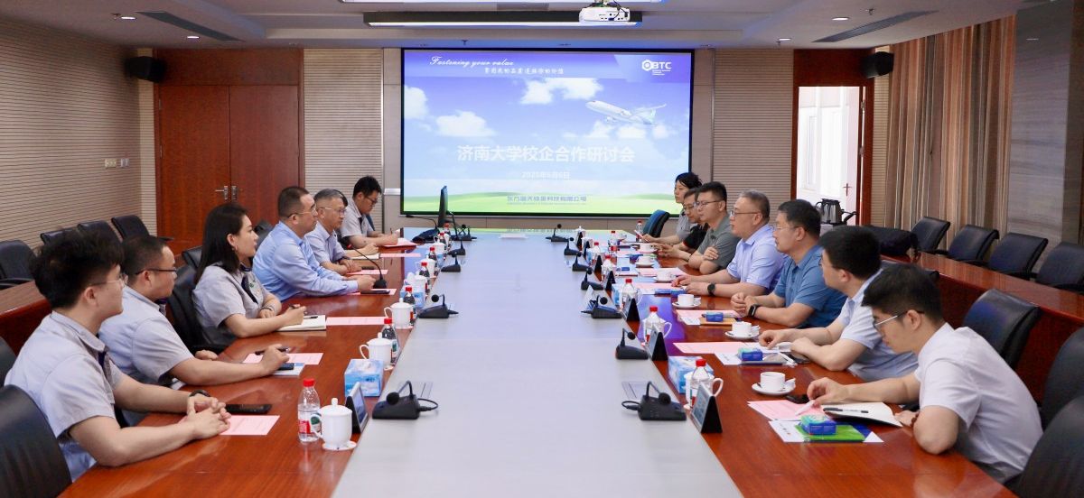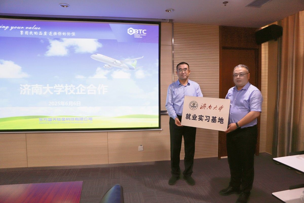 在煙臺(tái),黃加棟一行實(shí)地考察了東方藍(lán)天鈦金科技有限公司構(gòu)件成型、精加工及檢測(cè)生產(chǎn)線。座談會(huì)上,雙方圍繞企業(yè)在新材料、智能制造、新一代信息技術(shù)等領(lǐng)域的技術(shù)需求進(jìn)行了交流研討,在科技項(xiàng)目聯(lián)合申報(bào)、關(guān)鍵技術(shù)協(xié)同攻關(guān)、定向人才培養(yǎng)等方面達(dá)成共識(shí)。黃加棟與東方藍(lán)天鈦金科技負(fù)責(zé)人王肇宇共同為“濟(jì)南大學(xué)就業(yè)實(shí)習(xí)基地”揭牌。