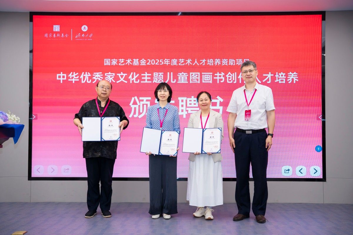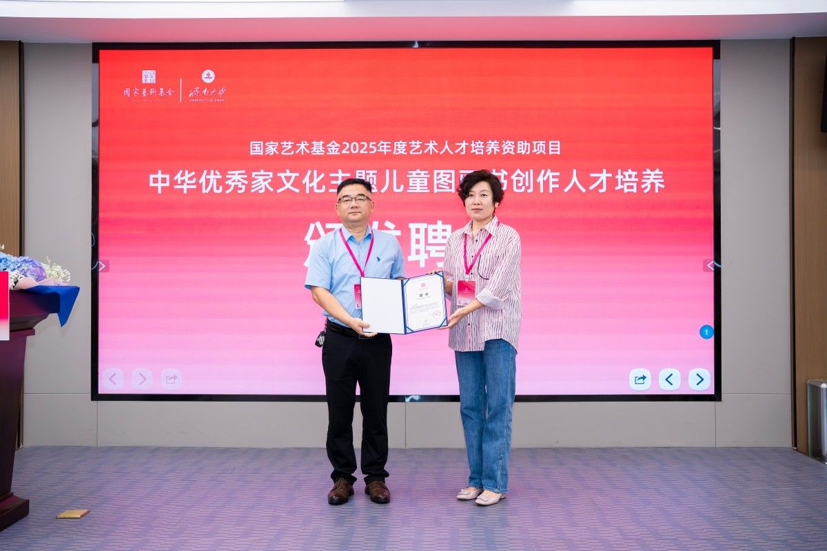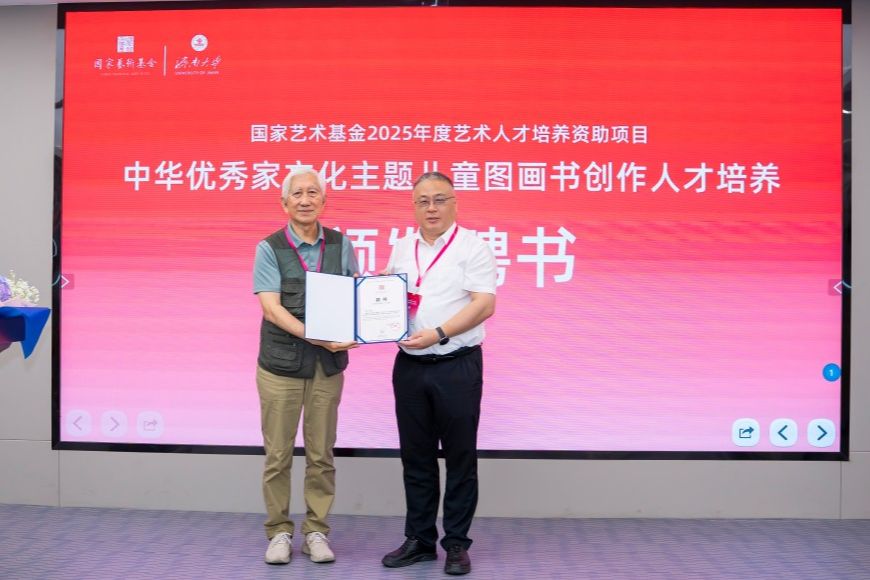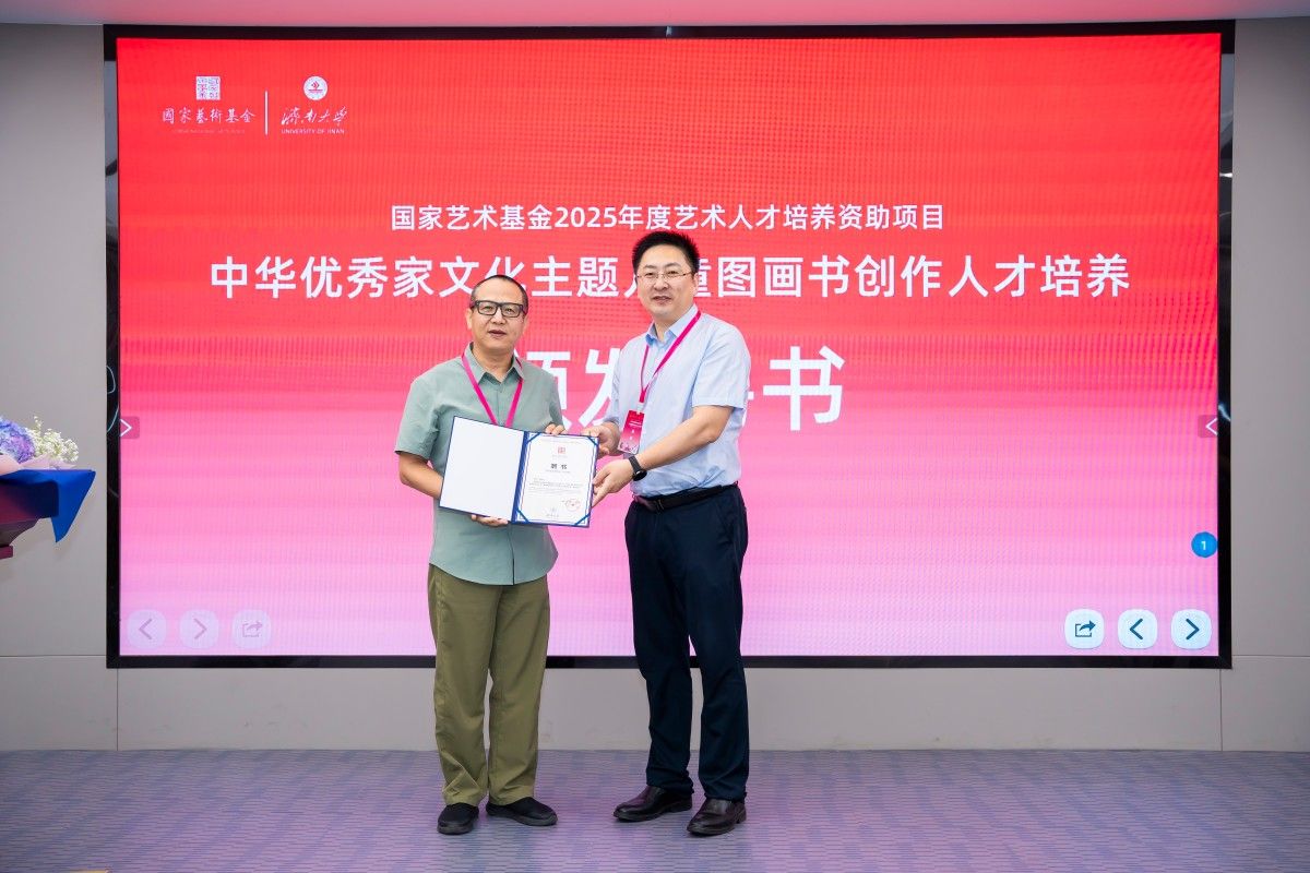 7月1日,國家藝術(shù)基金2025年度藝術(shù)人才培養(yǎng)資助項(xiàng)目“中華優(yōu)秀家文化主題兒童圖畫書創(chuàng)作人才培養(yǎng)”開班儀式在濟(jì)南大學(xué)舉行。清華大學(xué)首批文科資深教授柳冠中,山東省藝術(shù)研究院專職副書記、國家藝術(shù)基金山東項(xiàng)目管理辦公室主任李磊,山東省文藝評(píng)論家協(xié)會(huì)副主席、秘書長王之明,山東師范大學(xué)赫爾岑國際藝術(shù)學(xué)院院長劉東峰,山東工藝美術(shù)學(xué)院教務(wù)處處長顧群業(yè)。濟(jì)南大學(xué)黨委常委、副校長黃加棟,黨委常委、宣傳部部長盧旺,社科處、合作發(fā)展處、美術(shù)與設(shè)計(jì)學(xué)院相關(guān)負(fù)責(zé)人,項(xiàng)目教師授課代表及項(xiàng)目學(xué)員們參加本次儀式。開班儀式由濟(jì)南大學(xué)美術(shù)與設(shè)計(jì)學(xué)院副院長楊海波主持。