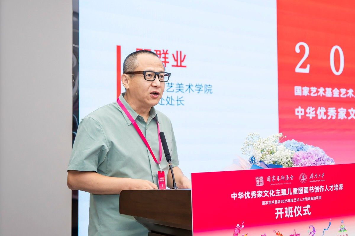 顧群業(yè)代表山東工藝美術(shù)學(xué)院對(duì)項(xiàng)目的順利啟動(dòng)表示熱烈祝賀,向濟(jì)南大學(xué)及全體學(xué)員致以誠摯問候。他表示,將博大精深、潤物無聲的中華優(yōu)秀家文化以最貼近兒童心靈的藝術(shù)形式進(jìn)行創(chuàng)造性轉(zhuǎn)化,具有重要意義。希望學(xué)員一方面懷揣“發(fā)現(xiàn)美的眼睛”和“研究者的熱忱”,深入體悟、精準(zhǔn)提煉這些寶貴的文化元素,將其有機(jī)融入創(chuàng)作之中;另一方面,要大膽嘗試新興媒介與技術(shù),賦予“家”的故事以動(dòng)態(tài)的生命力、鮮活的感染力與互動(dòng)的趣味性,讓傳統(tǒng)智慧在數(shù)智時(shí)代煥發(fā)新的生機(jī)。