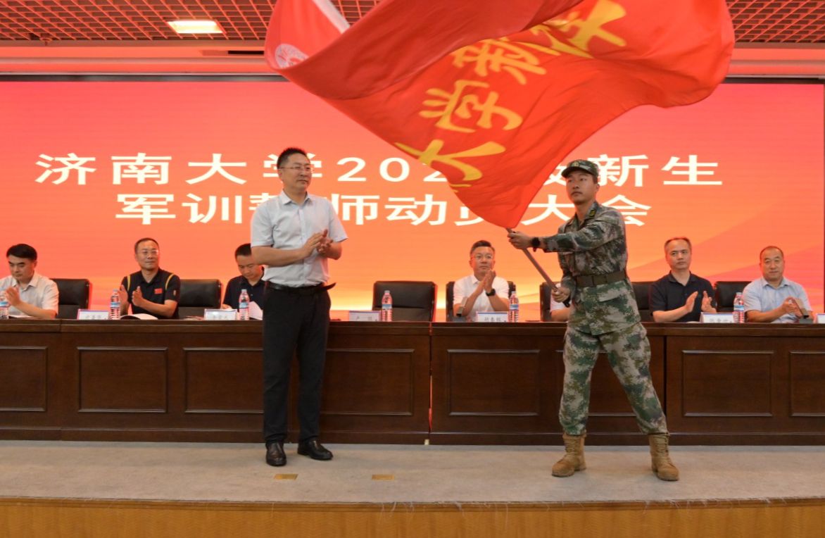 盧旺向軍訓(xùn)師授旗并代表學(xué)校黨委向參加此次軍訓(xùn)工作的各部門領(lǐng)導(dǎo)、各學(xué)院副書記、軍訓(xùn)教導(dǎo)大隊(duì)的軍訓(xùn)教官、跟訓(xùn)輔導(dǎo)員以及其他服務(wù)保障部門表示衷心的感謝和親切的問候。他指出,軍訓(xùn)是大學(xué)生國(guó)防教育的核心組成部分,承擔(dān)了國(guó)家法律賦予的重要使命。軍訓(xùn)期間,各位老師要充分關(guān)注并引導(dǎo)學(xué)生的思想動(dòng)態(tài)、成長(zhǎng)困惑,發(fā)揮豐富的工作經(jīng)驗(yàn),凝聚學(xué)校和學(xué)院力量,為軍訓(xùn)工作提供堅(jiān)實(shí)的組織保障,讓學(xué)生們?cè)谲娪?xùn)中感受到學(xué)校和學(xué)院的關(guān)懷與支持。同時(shí),軍訓(xùn)教官們要秉持軍人的高標(biāo)準(zhǔn)、嚴(yán)要求,科學(xué)施訓(xùn),將過(guò)硬的軍事技能和頑強(qiáng)的作風(fēng)毫無(wú)保留地傳授給學(xué)生。他充分肯定了今年軍訓(xùn)的前期準(zhǔn)備工作,并對(duì)做好2025級(jí)新生軍訓(xùn)工作提出了希望和要求:一是要深刻認(rèn)識(shí)軍訓(xùn)的目的和意義,以飽滿的熱情和積極的態(tài)度投入訓(xùn)練,不畏艱難、刻苦認(rèn)真,在掌握軍事技能的同時(shí)更要在訓(xùn)練中鍛造吃苦耐勞的堅(jiān)毅品格,培育團(tuán)結(jié)協(xié)作的集體意識(shí),樹立勇于進(jìn)取的奮斗精神,增強(qiáng)愛國(guó)報(bào)國(guó)的使命擔(dān)當(dāng)。二是要?jiǎng)?wù)必注意訓(xùn)練安全,遇到困難及時(shí)與教官、輔導(dǎo)員老師溝通交流。三是要銘記“弘毅、博學(xué)、求真、至善”的校訓(xùn),傳承“勤奮嚴(yán)謹(jǐn)、團(tuán)結(jié)創(chuàng)新”的校風(fēng),發(fā)揚(yáng)“艱苦奮斗、凝心聚力、追求卓越”的精神,用理想之光照亮未來(lái)成長(zhǎng)之路,學(xué)有所成、學(xué)有所獲,在勇立時(shí)代潮頭中書寫精彩無(wú)悔的青春華章。相信經(jīng)過(guò)軍訓(xùn)的淬煉,同學(xué)們一定能以颯爽的英姿、嚴(yán)明的紀(jì)律、昂揚(yáng)的面貌,完美交出大學(xué)階段的第一份答卷,展現(xiàn)濟(jì)大學(xué)子的卓越風(fēng)采。