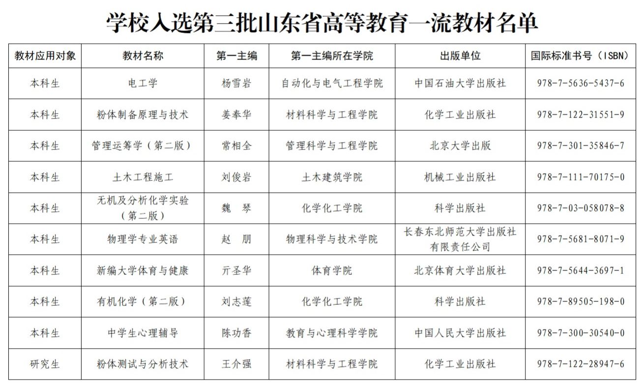 近日,山東省教材委員會(huì)辦公室發(fā)布了《關(guān)于公布第三批山東省普通高等教育一流教材名單的通知》,我校共有10部教材入選,其中本科生教材9部,研究生教材1部,入選總數(shù)創(chuàng)學(xué)校歷史新高。