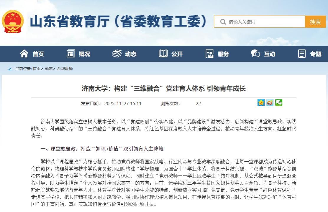 11月27日,山東教育廳官網(wǎng)刊發(fā)通訊稿《濟(jì)南大學(xué):構(gòu)建“三維融合”黨建育人體系引領(lǐng)青年成長(zhǎng)》,全文如下: