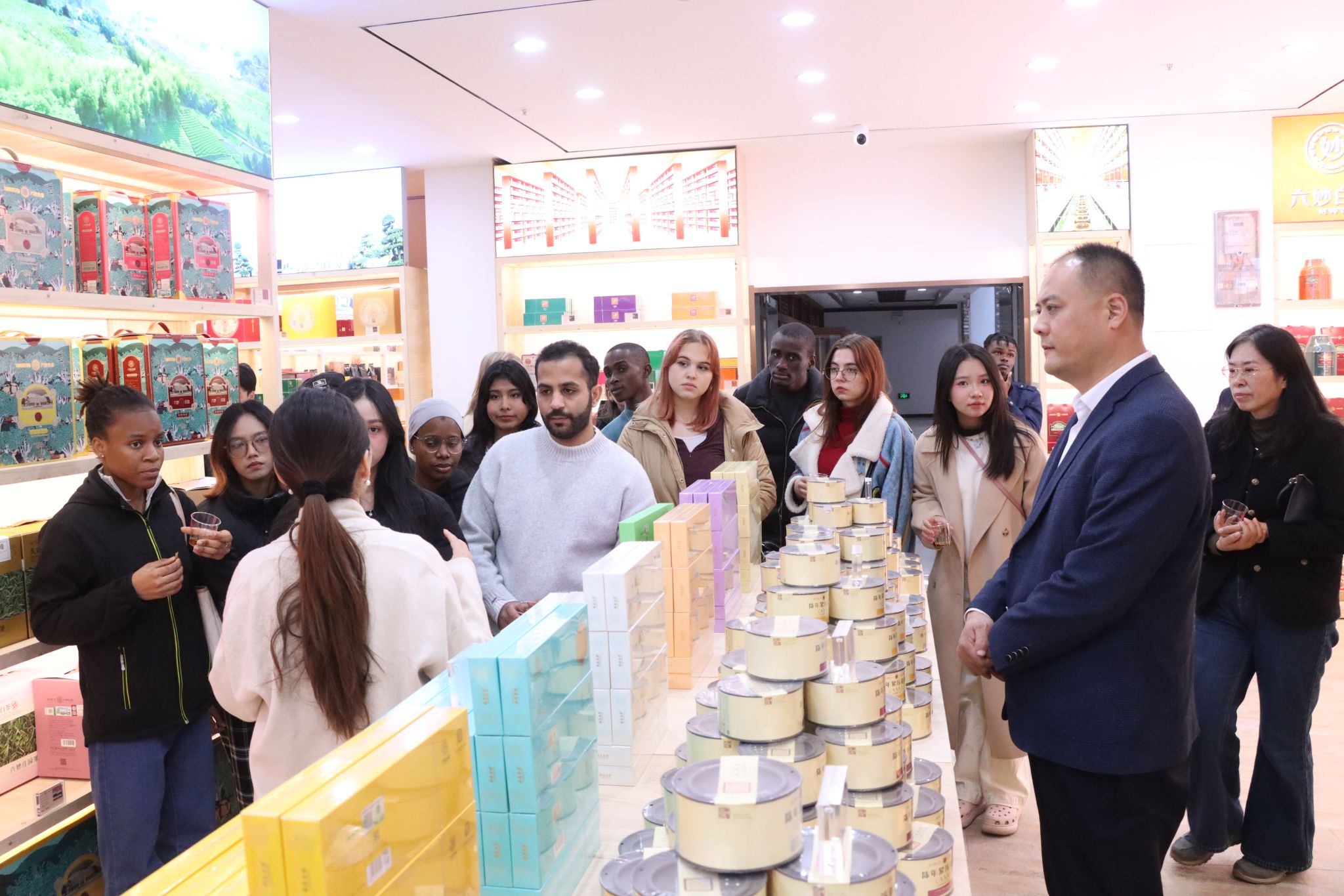 國際學(xué)生一行人參觀集團(tuán)標(biāo)志性建筑,了解廣友集團(tuán)企業(yè)文化及發(fā)展歷程,為國際學(xué)生建立茶產(chǎn)業(yè)的宏觀認(rèn)知;訪問創(chuàng)虹茶業(yè)展示區(qū),感受傳統(tǒng)工藝與茶文化的融合之美;參觀六妙白茶博物館,聆聽國家級非物質(zhì)文化遺產(chǎn)“福鼎白茶”的傳統(tǒng)制作技藝、歷史傳承及產(chǎn)品特質(zhì),深化對中國名茶的認(rèn)知;走進(jìn)濟(jì)南1953·茶文化創(chuàng)意產(chǎn)業(yè)園,實(shí)地考察茶產(chǎn)業(yè)與文化創(chuàng)意產(chǎn)業(yè)融合發(fā)展的實(shí)踐成果,了解茶文化創(chuàng)新傳播的多元路徑;觀賞專業(yè)茶藝表演,深入了解茶道禮儀、泡茶技藝的細(xì)節(jié)規(guī)范,親自動(dòng)手實(shí)踐泡茶流程,沉浸式感受中國茶藝的禮儀內(nèi)涵與文化底蘊(yùn)。
