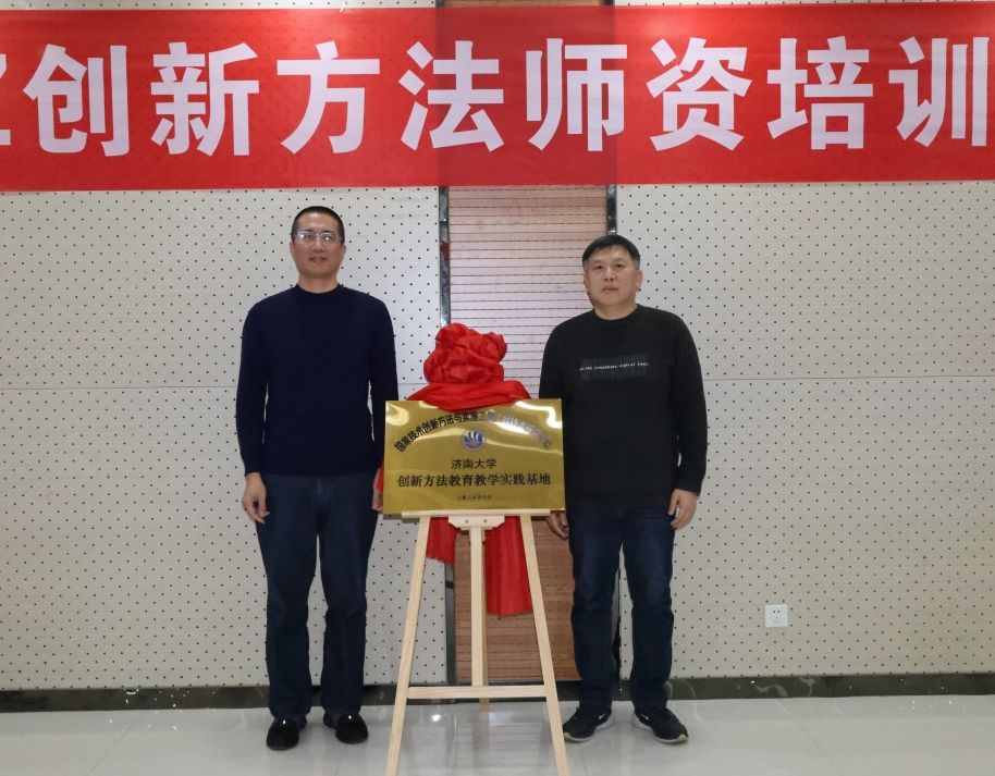 儀式上,曹國忠與高常青為國家技術創(chuàng)新方法與實施工具工程技術研究中心濟南大學創(chuàng)新方法教育教學實踐基地揭牌。