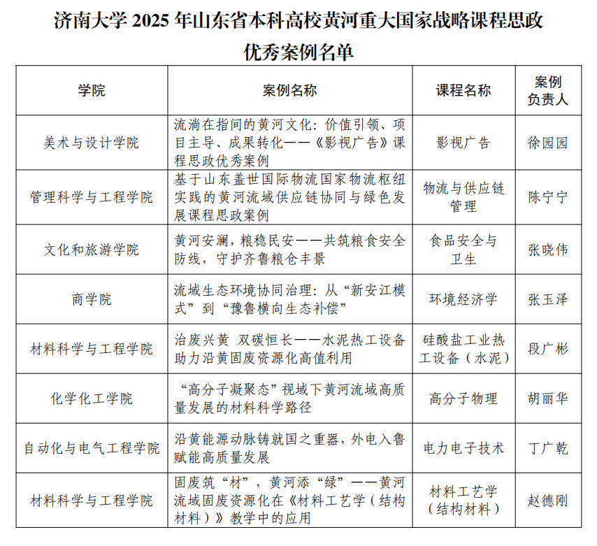 近日,山東省高等學(xué)校課程思政研究中心正式公布2025年山東省本科高校黃河重大國(guó)家戰(zhàn)略課程思政優(yōu)秀案例名單,我校推薦的8個(gè)案例全部成功入選,充分體現(xiàn)了我校在課程思政建設(shè)與黃河重大國(guó)家戰(zhàn)略深度融合方面的顯著成效。