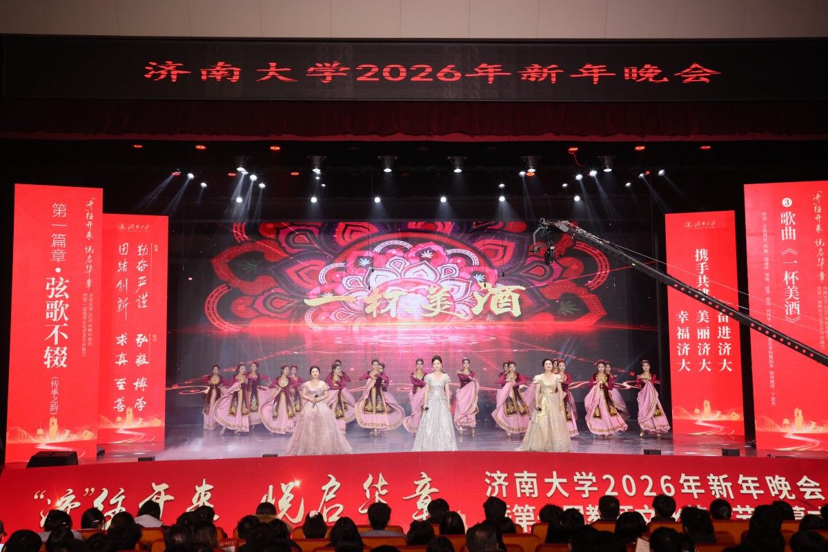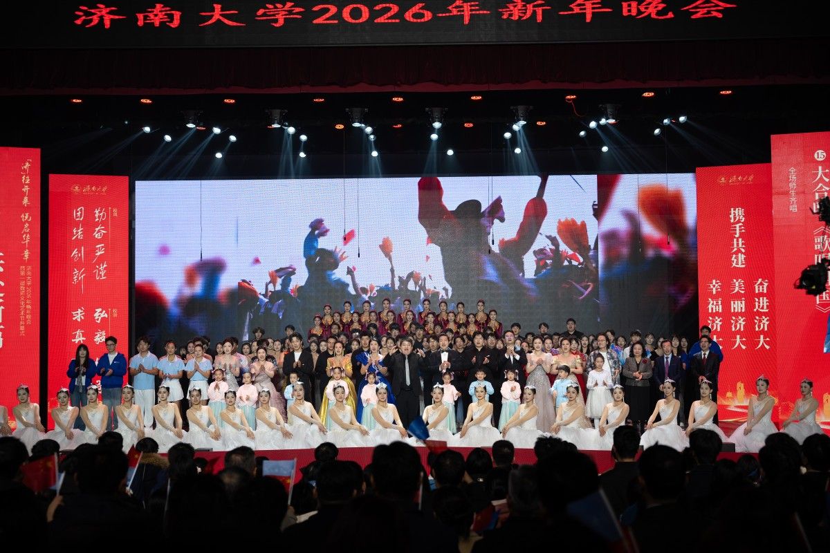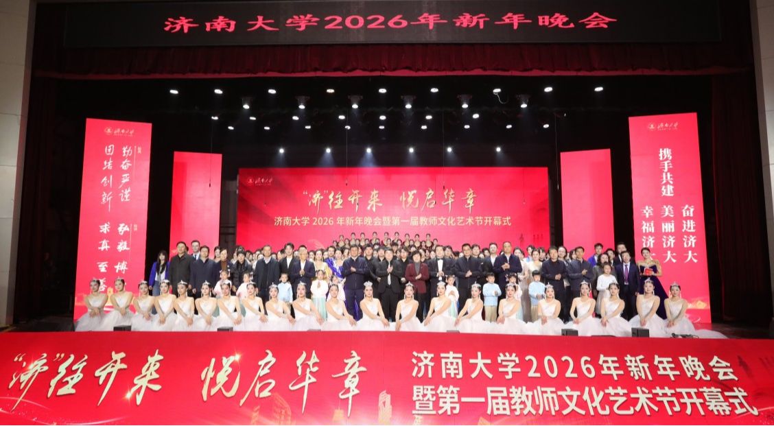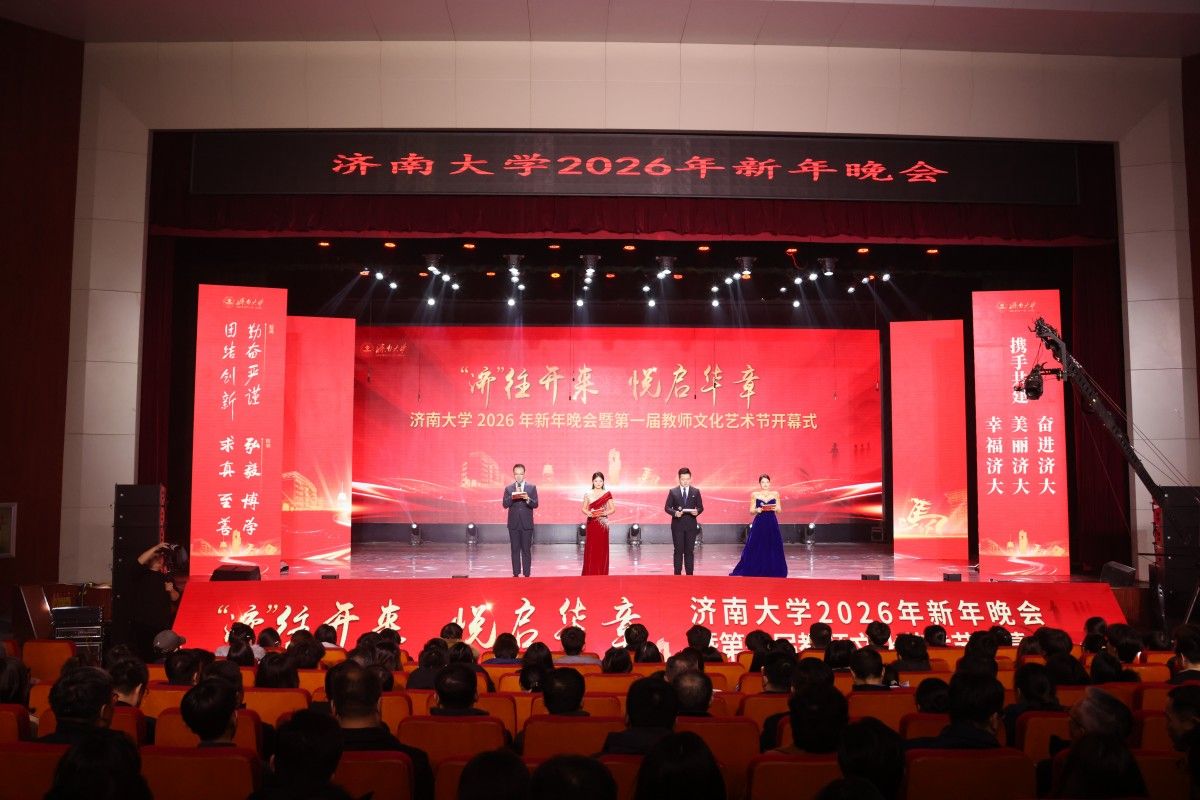 新元肇啟,華章日新。12月30日晚,“‘濟(jì)’往開(kāi)來(lái),悅啟華章”濟(jì)南大學(xué)2026年新年晚會(huì)暨第一屆教師文化藝術(shù)節(jié)開(kāi)幕式在學(xué)校禮堂舉行。濟(jì)南市委常委、宣傳部部長(zhǎng)、市委教育工委書(shū)記馬保嶺,濟(jì)南大學(xué)黨委書(shū)記劉春華,中國(guó)建設(shè)銀行山東省分行黨委委員、副行長(zhǎng)包建軍,山東省教育廳體衛(wèi)藝處處長(zhǎng)王桂龍,濟(jì)南市教育局總督學(xué)馬炳光,濟(jì)南市市中區(qū)委常委、宣傳部長(zhǎng)張?jiān)?,?jì)南大學(xué)黨委副書(shū)記商華、張慶國(guó),黨委常委、紀(jì)委書(shū)記、省監(jiān)委駐濟(jì)南大學(xué)監(jiān)察專員續(xù)鐵,黨委常委、副校長(zhǎng)李強(qiáng)、滕晉,黨委常委、統(tǒng)戰(zhàn)部部長(zhǎng)徐慶國(guó),黨委常委、宣傳部部長(zhǎng)盧旺,五百余名師生、校友和來(lái)自中國(guó)建設(shè)銀行山東省分行、濟(jì)南分行,山東省文化館、山東省歌舞劇院、山東省音樂(lè)家協(xié)會(huì)、山東省舞蹈家協(xié)會(huì)、濟(jì)南市音樂(lè)家協(xié)會(huì)、濟(jì)南市文化館、濟(jì)南市文藝創(chuàng)作研究院、濟(jì)南市呂劇院、濟(jì)南市教科院,市中區(qū)七賢街道黨工委等單位的領(lǐng)導(dǎo)嘉賓一同現(xiàn)場(chǎng)觀看演出。同步線上直播3萬(wàn)余人觀看,點(diǎn)贊數(shù)超11萬(wàn)。