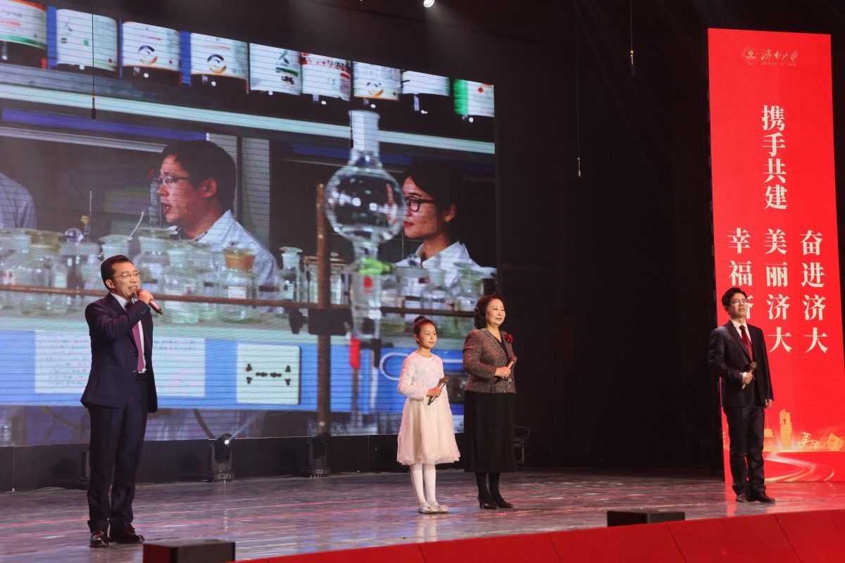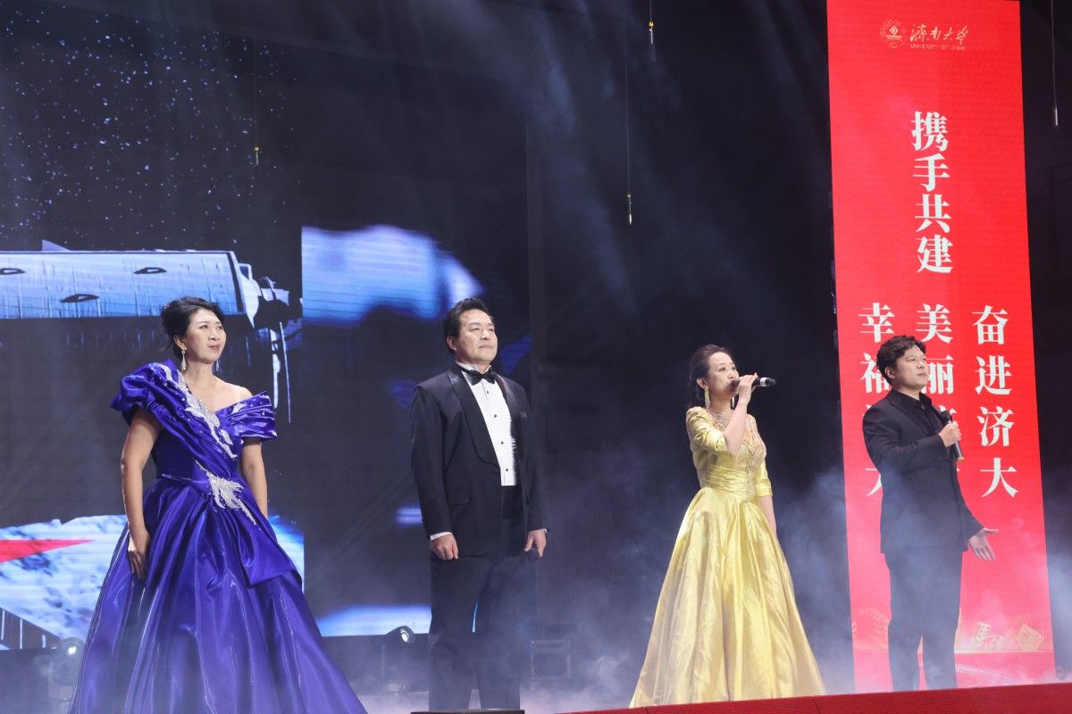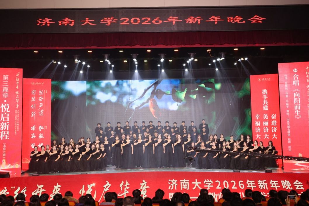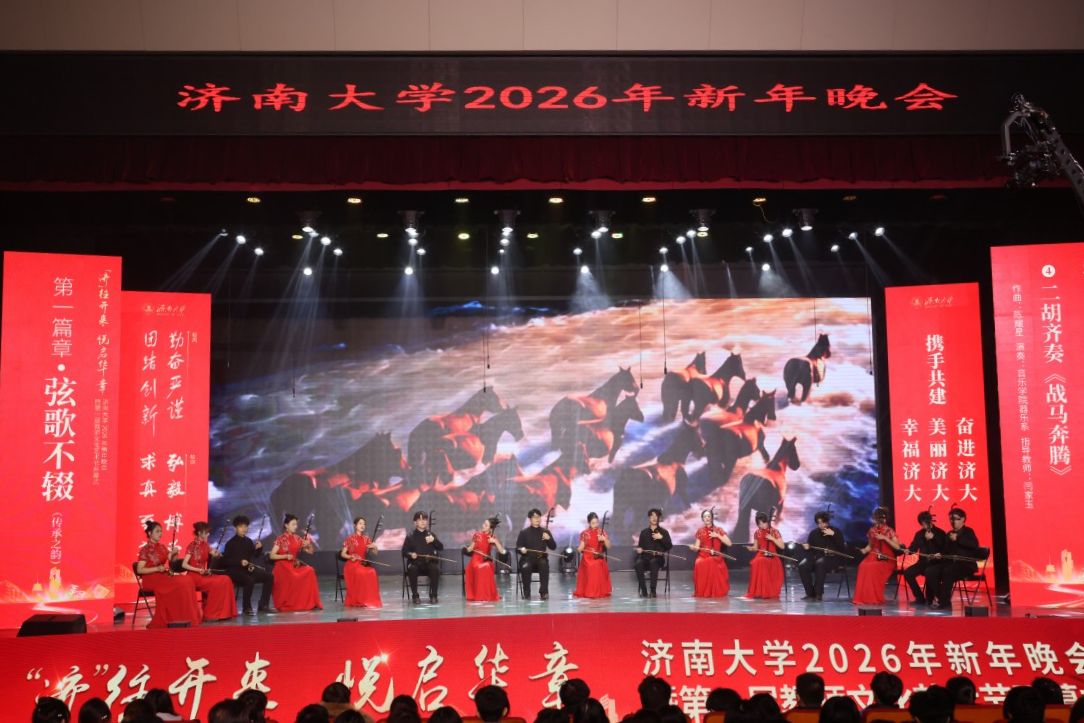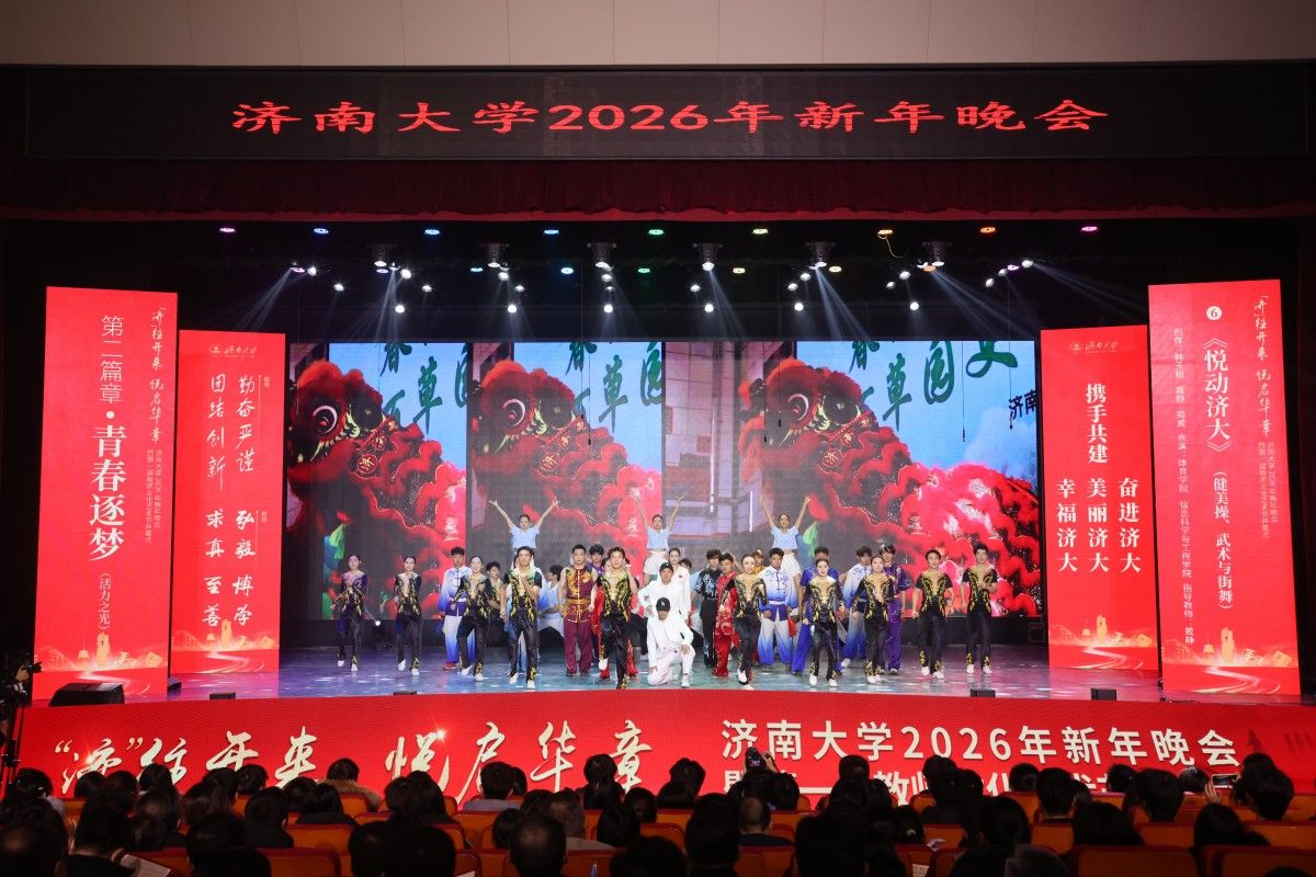 新元肇啟,華章日新。12月30日晚,“‘濟(jì)’往開(kāi)來(lái),悅啟華章”濟(jì)南大學(xué)2026年新年晚會(huì)暨第一屆教師文化藝術(shù)節(jié)開(kāi)幕式在學(xué)校禮堂舉行。濟(jì)南市委常委、宣傳部部長(zhǎng)、市委教育工委書(shū)記馬保嶺,濟(jì)南大學(xué)黨委書(shū)記劉春華,中國(guó)建設(shè)銀行山東省分行黨委委員、副行長(zhǎng)包建軍,山東省教育廳體衛(wèi)藝處處長(zhǎng)王桂龍,濟(jì)南市教育局總督學(xué)馬炳光,濟(jì)南市市中區(qū)委常委、宣傳部長(zhǎng)張?jiān)?,?jì)南大學(xué)黨委副書(shū)記商華、張慶國(guó),黨委常委、紀(jì)委書(shū)記、省監(jiān)委駐濟(jì)南大學(xué)監(jiān)察專員續(xù)鐵,黨委常委、副校長(zhǎng)李強(qiáng)、滕晉,黨委常委、統(tǒng)戰(zhàn)部部長(zhǎng)徐慶國(guó),黨委常委、宣傳部部長(zhǎng)盧旺,五百余名師生、校友和來(lái)自中國(guó)建設(shè)銀行山東省分行、濟(jì)南分行,山東省文化館、山東省歌舞劇院、山東省音樂(lè)家協(xié)會(huì)、山東省舞蹈家協(xié)會(huì)、濟(jì)南市音樂(lè)家協(xié)會(huì)、濟(jì)南市文化館、濟(jì)南市文藝創(chuàng)作研究院、濟(jì)南市呂劇院、濟(jì)南市教科院,市中區(qū)七賢街道黨工委等單位的領(lǐng)導(dǎo)嘉賓一同現(xiàn)場(chǎng)觀看演出。同步線上直播3萬(wàn)余人觀看,點(diǎn)贊數(shù)超11萬(wàn)。