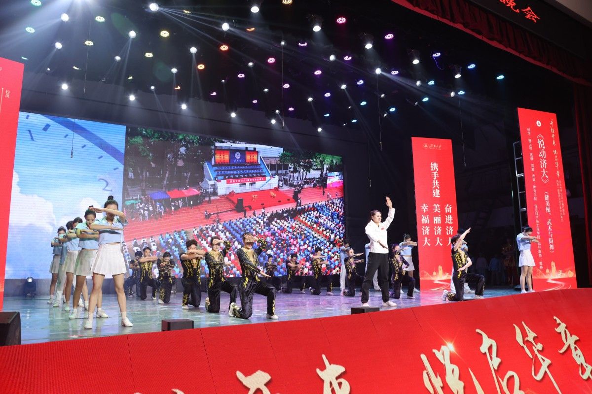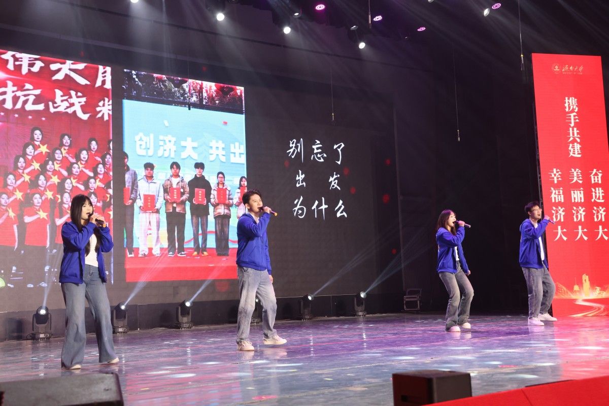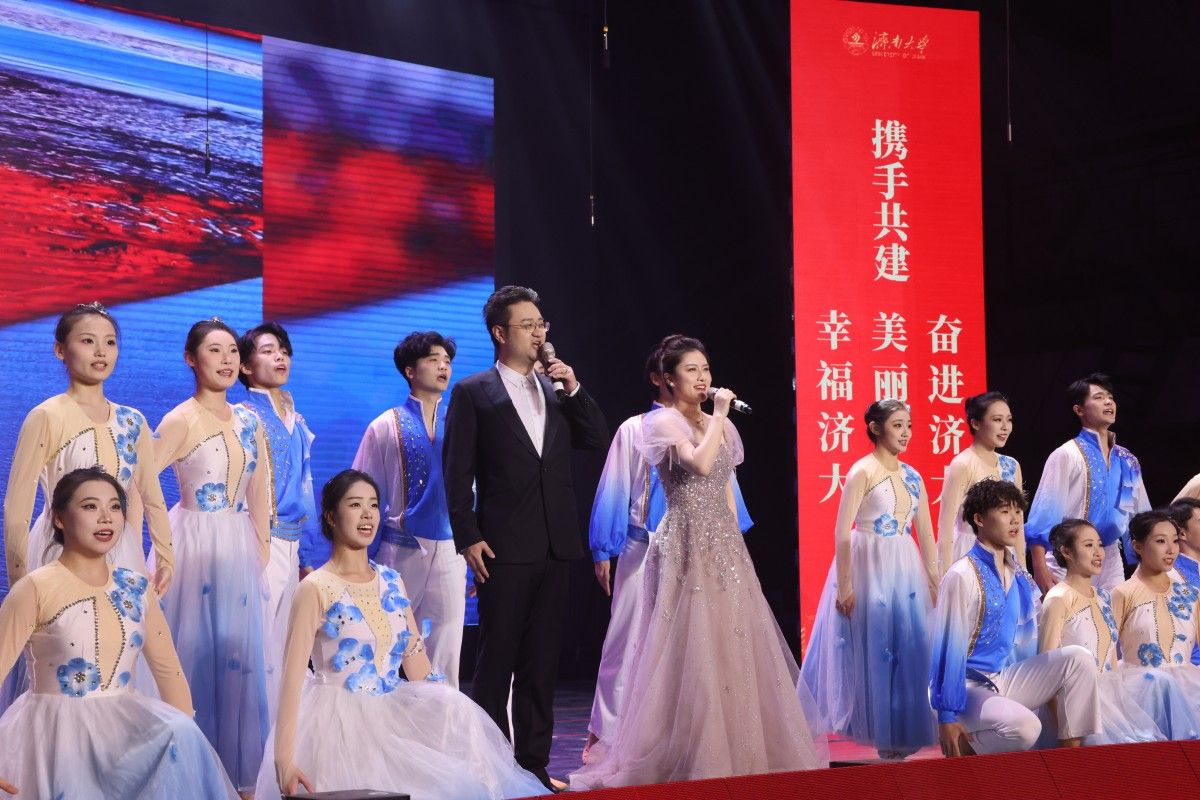 新年晚會(huì)在動(dòng)感十足的鼓樂(lè)《龍騰虎躍》中拉開(kāi)序幕,鼓聲激蕩、樂(lè)韻鏗鏘。晚會(huì)分為“弦歌不輟”“青春逐夢(mèng)”“悅啟新程”三個(gè)篇章。第一篇章弦歌不輟中,舞蹈《額爾古納河》讓我們感受到了大草原的深情和西域的熱烈;歌曲《一杯美酒》分外醇香;二胡齊奏《戰(zhàn)馬奔騰》讓我們仿佛置身于廣袤的沙場(chǎng),心中是奔涌的熱血。歌曲《別忘了為什么出發(fā)》體現(xiàn)了初心是青春最亮的燈塔,逐夢(mèng)是青春最美的姿態(tài)。第二篇章青春逐夢(mèng)中,健美操、武術(shù)與街舞表演的《悅動(dòng)濟(jì)大》展現(xiàn)了力與美,剛與柔,傳統(tǒng)與現(xiàn)代的完美交融;幼兒園小朋友們合唱的《小池》歌聲凈甜美。校友丁曉鵬演唱的歌曲《就在這瞬間》為我們定格了青春的美好瞬間;唐磊演唱的《丁香花》音韻悠長(zhǎng),正是時(shí)光給予我們共同的回響。第三篇章悅啟新程中,歌曲《再一次出發(fā)》、朗誦《濟(jì)大榮光 共赴新程》展現(xiàn)了全體濟(jì)大人秉承濟(jì)大精神,乘風(fēng)破浪,逐光而行。舞蹈《野草隨想》、四重唱《祖國(guó)不會(huì)忘記》是對(duì)平凡人堅(jiān)韌、執(zhí)著和平凡崗位上默默奉獻(xiàn)者的贊歌。合唱《向陽(yáng)而上》體現(xiàn)了每一份蓬勃的力量都根植于溫暖而堅(jiān)實(shí)的土壤中。最后,晚會(huì)在全場(chǎng)合唱《歌唱祖國(guó)》中落下帷幕。高潮迭起,盛宴流芳。新年晚會(huì)彰顯了濟(jì)大人的家國(guó)情懷和濟(jì)大精神,為觀眾帶來(lái)了一場(chǎng)沉浸式的視覺(jué)盛宴,現(xiàn)場(chǎng)互動(dòng)頻頻,氣氛熱烈。