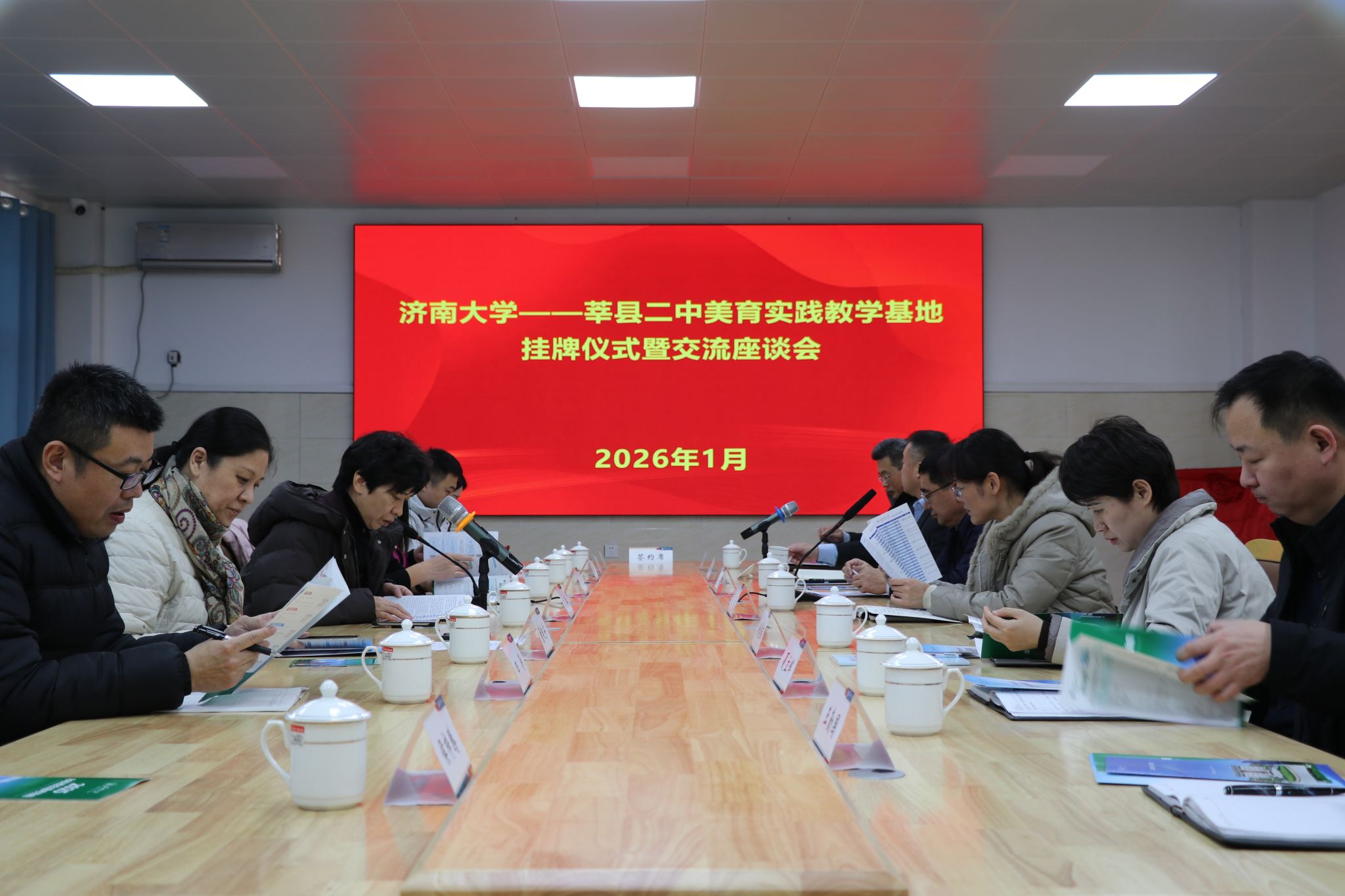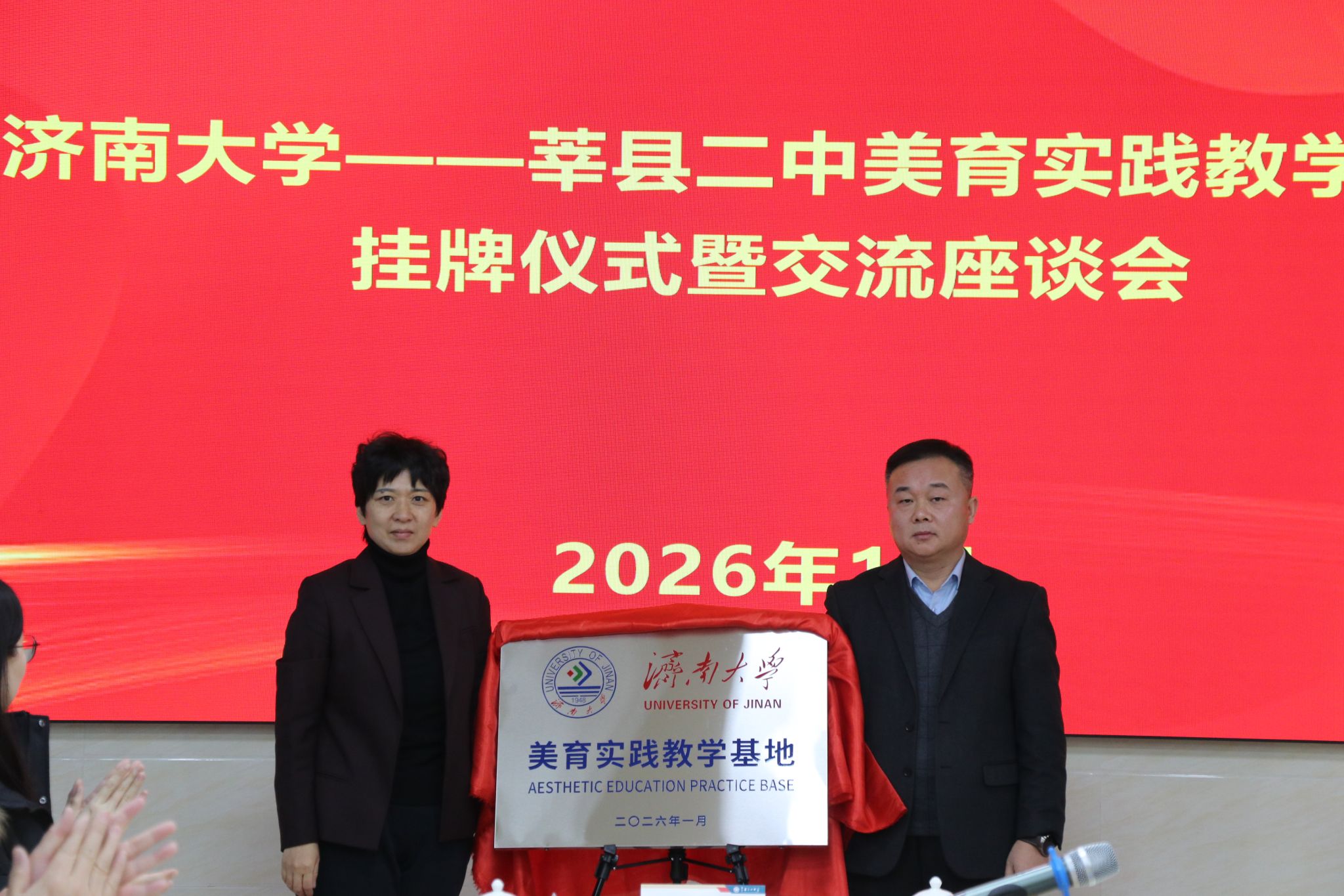 隨后,“濟南大學(xué)——莘縣二中美育實踐教學(xué)基地”掛牌儀式暨交流座談會在莘縣二中隆重舉行。儀式上,商華與莘縣二中黨委書記劉云俠共同為基地揭牌,標志著校地雙方在美育協(xié)同育人領(lǐng)域的深度合作正式啟航。商華表示,濟南大學(xué)始終堅持“以文化人,以美育人”的育人理念,著力構(gòu)建“大美育”工作格局,音樂學(xué)院更是我校美育建設(shè)主陣地,此次美育實踐教學(xué)基地的建立,是學(xué)校落實美育浸潤行動、推動優(yōu)質(zhì)教育資源下沉基層的重要舉措,更是校地雙方優(yōu)勢互補、資源共享的戰(zhàn)略契合。她希望雙方以基地為紐帶,在課程開發(fā)、師資共建、藝術(shù)實踐等方面開展全方位合作。劉云俠介紹了莘縣二中的師資力量和學(xué)生培養(yǎng)情況,他表示,基地的掛牌為學(xué)校美育工作注入了強勁動力,學(xué)校將以此為契機,積極借鑒濟大先進教育理念,深耕美育教學(xué)改革,讓學(xué)生在美育浸潤中全面發(fā)展。