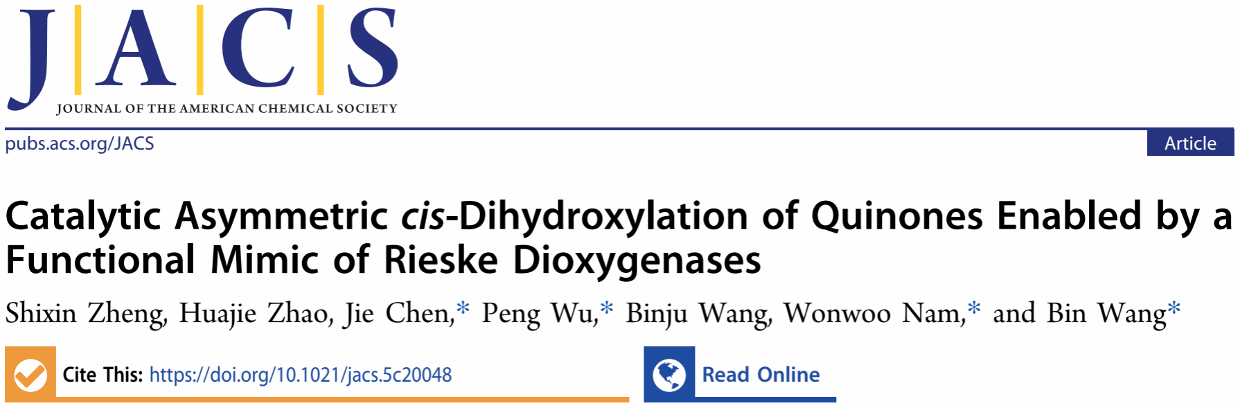 近日,我校化學(xué)化工學(xué)院王斌教授課題組在化學(xué)領(lǐng)域權(quán)威期刊《美國化學(xué)會志》發(fā)表題為“Catalytic Asymmetric cis-Dihydroxylation of Quinones Enabled by a Functional Mimic of Rieske Dioxygenases”的研究論文(J. Am. Chem. Soc. 2026, https://doi.org/10.1021/jacs.5c20048)。該研究模仿自然界金屬酶的催化機(jī)制,首次實(shí)現(xiàn)了非血紅素錳配合物催化醌類化合物的不對稱順式雙羥化反應(yīng),為手性鄰二醇類化合物的高效合成提供了綠色新策略。