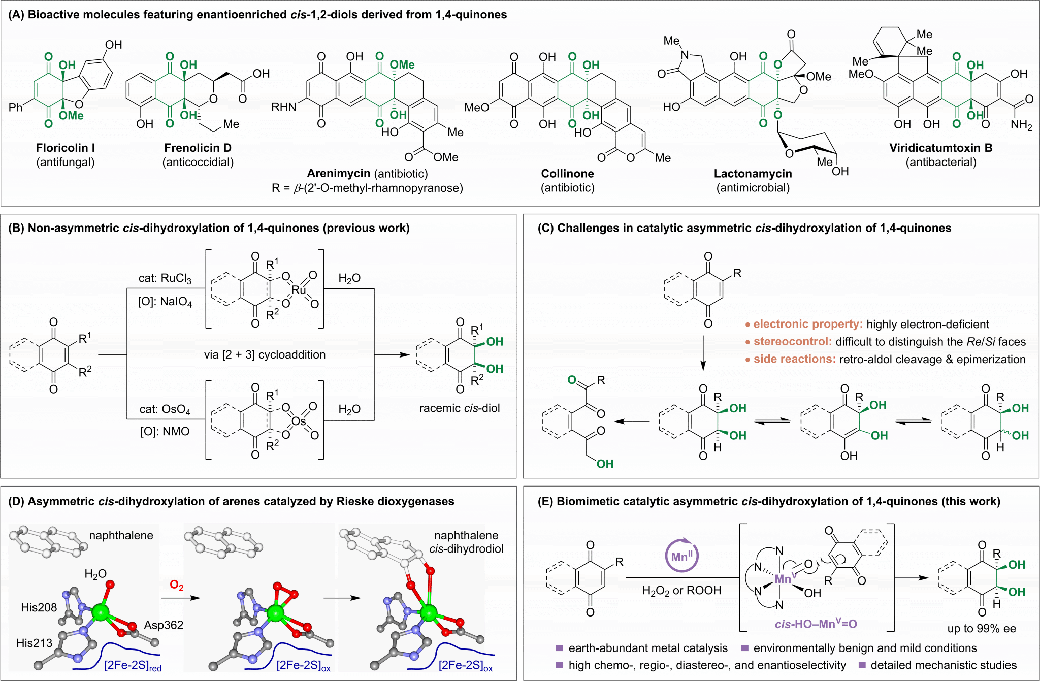 手性順式-1,2-二醇是一類重要的化學(xué)結(jié)構(gòu)單元,廣泛存在于具有抗腫瘤、抗菌等生物活性的Ⅱ型聚酮天然產(chǎn)物和藥物分子中(圖1A)。不對稱順式雙羥化反應(yīng)雖是合成該類結(jié)構(gòu)最直接的途徑(圖1B),但對醌類化合物長期難以奏效。傳統(tǒng)Sharpless不對稱雙羥化等方法面臨四大瓶頸(圖1C):醌類底物電子缺乏導(dǎo)致C=C雙鍵反應(yīng)活性低;平面結(jié)構(gòu)對稱性強(qiáng),阻礙手性催化劑有效識別;生成的順式-1,2-二醇易發(fā)生差向異構(gòu)化;產(chǎn)物對逆羥醛裂解敏感。這一挑戰(zhàn)制約了相關(guān)天然產(chǎn)物和藥物的合成研究。