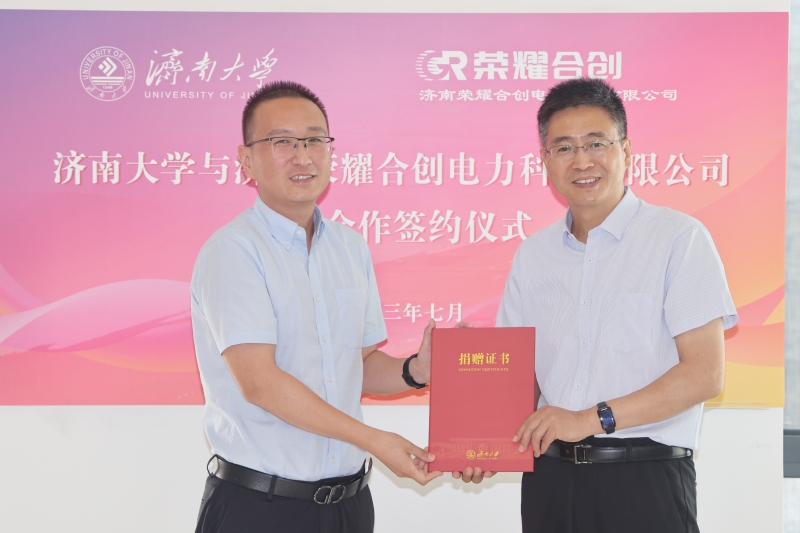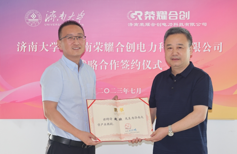 查玉喜為魏欣頒發濟南大學產業教授聘書。對濟南榮耀合創電力科技有限公司給予學校發展的關心支持表示感謝,并介紹了學校的辦學歷史、發展近況以及在產學研協同創新方面取得的主要成效。他指出,濟南榮耀合創電力科技有限公司的產業定位、發展目標與濟南大學相關學科專業、科研優勢高度契合,雙方擁有深化合作的較大潛力。濟南大學自動化與電氣工程學院與濟南榮耀合創電力科技有限公司牽手合作,在人才培養、科學研究、支部共建、捐資助學助教等方面共同發力,是落實黨的二十大精神的新行動,更是新時代校企合作的新成果,開啟了我們兩家合作的新階段。特別是,濟南榮耀合創電力科技有限公司捐贈25萬元設立“榮耀獎教基金”,體現了公司厚重的社會擔當、深厚的教育情懷。定會激勵青年學子奮發進取、成長成才,鼓舞教職員工愛崗敬業、立德樹人。學校學院將強化校企合作,充分發揮人才智力優勢,為企業發展、為地方經濟社會發展作出更大努力。
