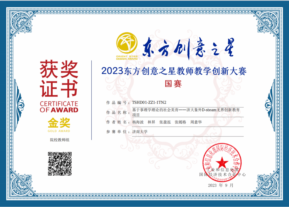 近日,第四屆東方創(chuàng)意之星教師教學(xué)創(chuàng)新大賽國(guó)賽評(píng)審會(huì)在江蘇大學(xué)舉辦,我校美術(shù)與設(shè)計(jì)學(xué)院楊海波中華美育無界創(chuàng)新教研團(tuán)隊(duì)經(jīng)過激烈角逐,從全國(guó)1502個(gè)參賽隊(duì)伍中脫穎而出,榮獲金獎(jiǎng)。