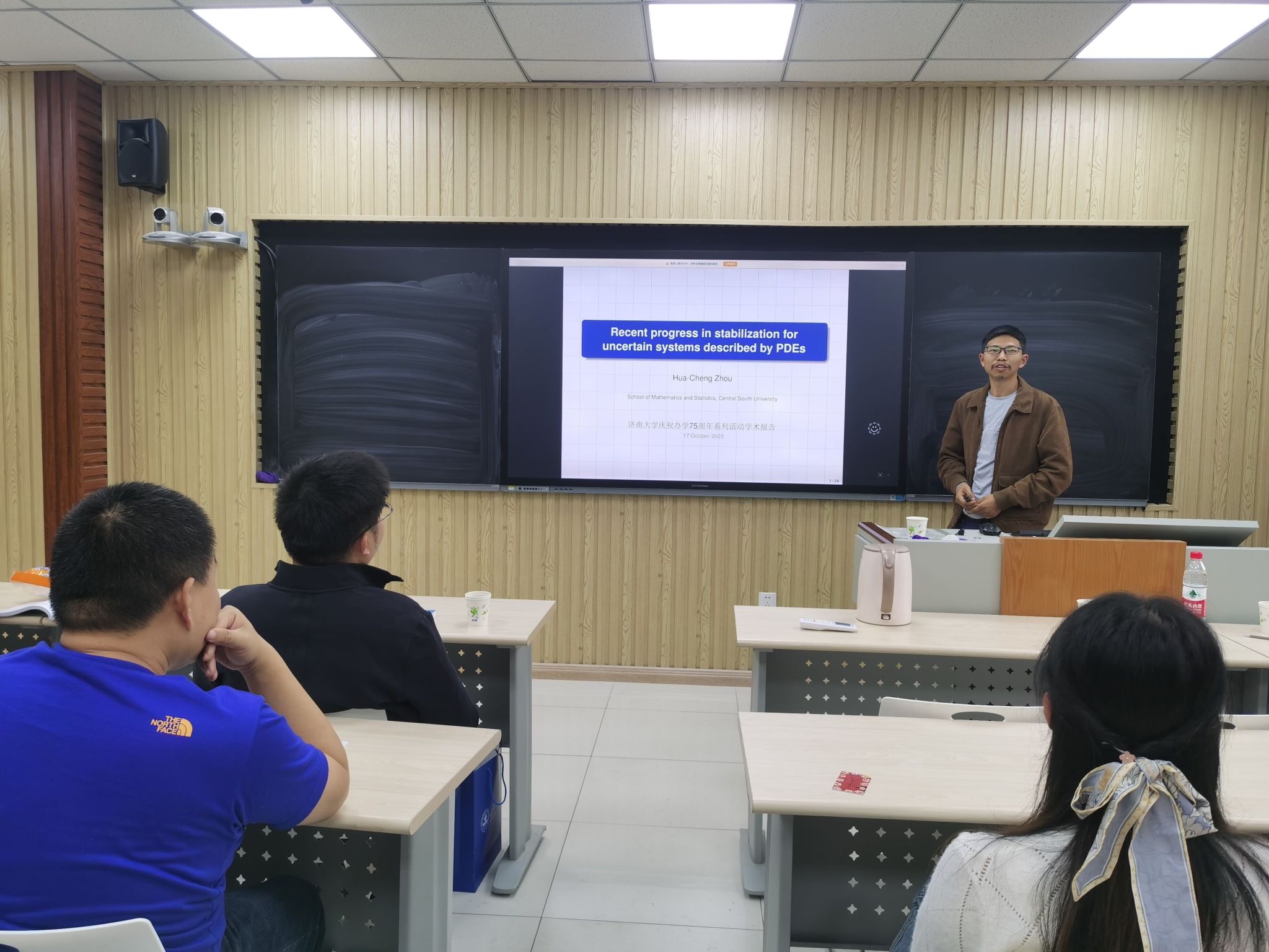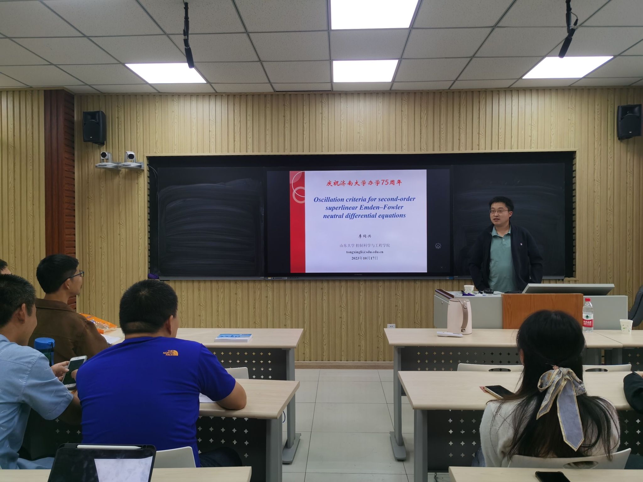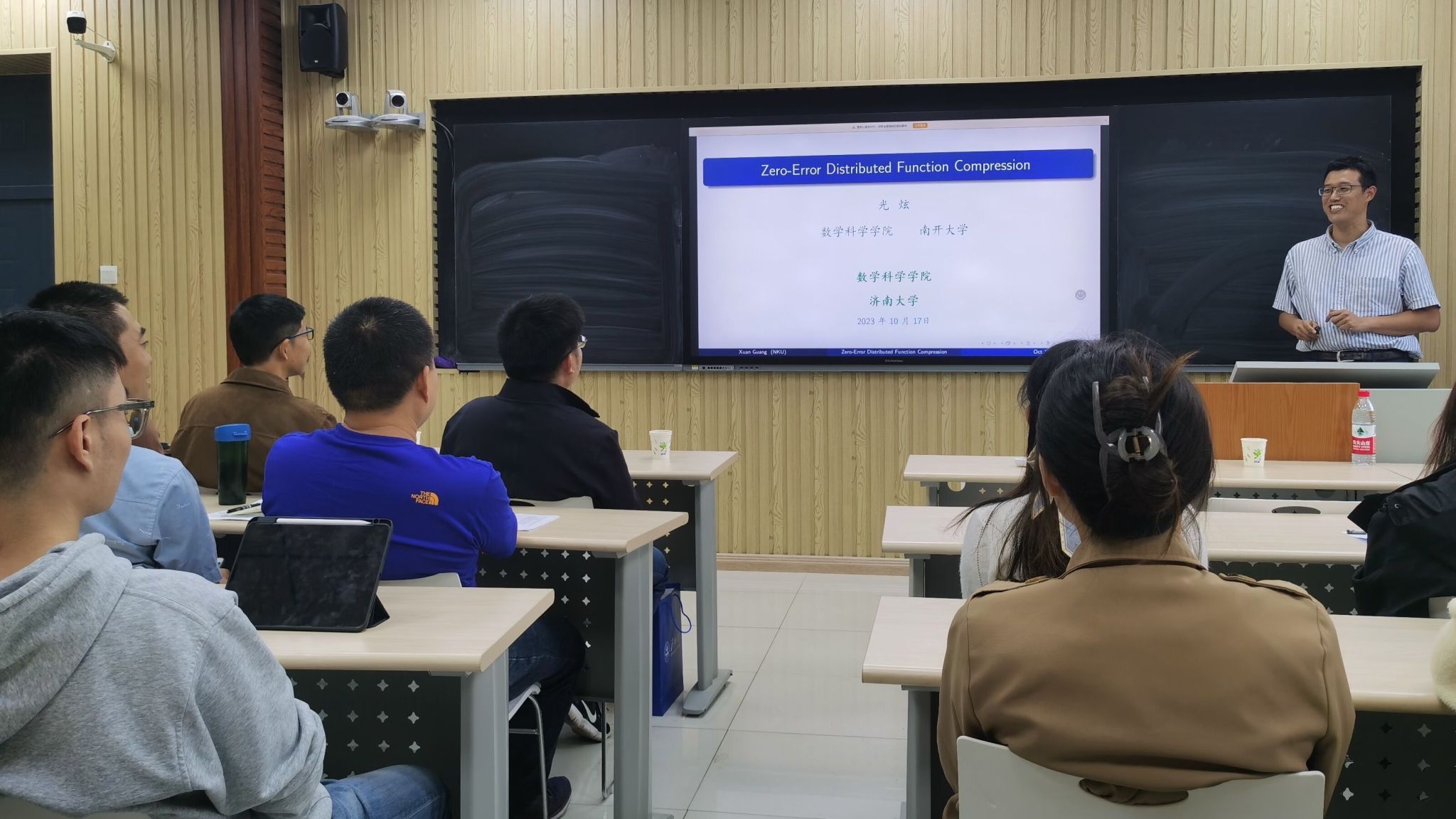 系列學(xué)術(shù)報(bào)告活動(dòng)先后邀請(qǐng)了南開(kāi)大學(xué)教授、博士生導(dǎo)師、入選國(guó)家級(jí)“四青”人才項(xiàng)目及南開(kāi)大學(xué)百名青年學(xué)科帶頭人培養(yǎng)計(jì)劃成員、學(xué)院2005屆信息與計(jì)算科學(xué)專業(yè)校友光炫,中南大學(xué)教授、博士生導(dǎo)師、國(guó)家高層次青年人才、學(xué)院2009屆信息與計(jì)算科學(xué)專業(yè)校友周華成,山東大學(xué)教授、博士生導(dǎo)師、齊魯青年學(xué)者、教育部學(xué)科(控制科學(xué)與工程)評(píng)估專家、學(xué)院2007屆數(shù)學(xué)與應(yīng)用數(shù)學(xué)專業(yè)校友李同興。專家學(xué)者們各自分享了他們?cè)跀?shù)學(xué)科學(xué)領(lǐng)域的最新研究成果和前沿動(dòng)態(tài),內(nèi)容涵蓋了多個(gè)領(lǐng)域,光炫教授在《Zero-Error Distributed Function Compression》中提出了兩個(gè)二進(jìn)制無(wú)內(nèi)存源X和Y的零誤差分布式函數(shù)壓縮系統(tǒng)模型;周華成教授以《Recent progress in stabilization for uncertain systems described by PDEs》為題介紹偏微分方程描述的不確定系統(tǒng)穩(wěn)定的最新進(jìn)展;李同興教授在《Oscillation criteria for second-order superlinear Emden-Fowler neutral differential equations》中介紹了二階超線性埃姆登-福勒中立性微分方程的振蕩準(zhǔn)則。