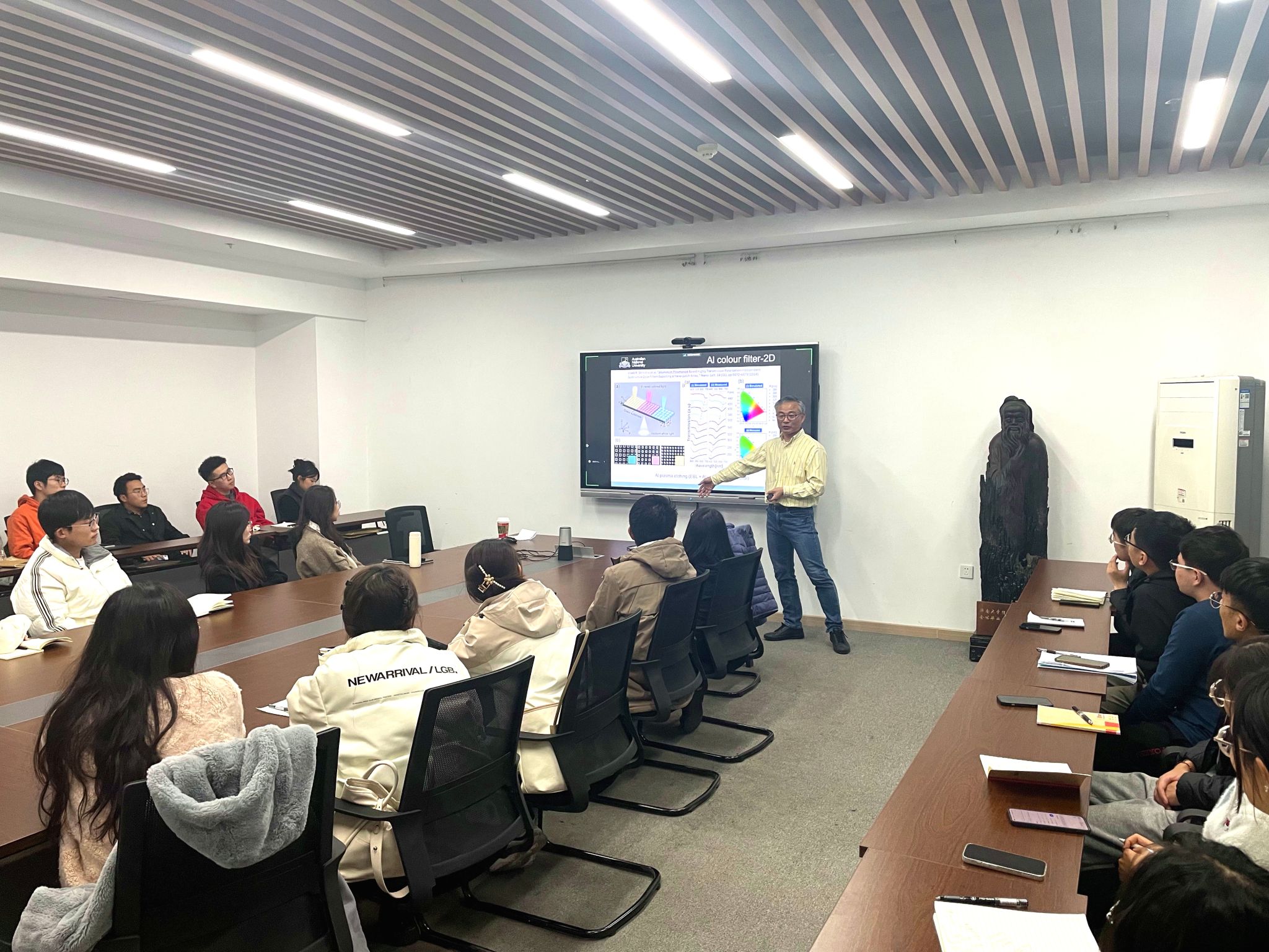 Choi教授在報告中首先詳細講解了他所熟練掌握的基于電子束光刻和原子層沉積工藝技術面向金屬、半導體、介電材料在不同納米尺度下的人工微結構制備流程,細致介紹了其中有關少層和雙面納米結構精準制備的關鍵技術難點,并展示了由他親自加工制備的多種高加工精度納米結構?;谶@些納米結構所構筑的超構器件,他與合作者開展了面向不同領域的應用探索,包括紅外傳感、溶液識別、信息加密、激光雷達、片上波導、量子芯片、光鑷微粒操縱、結構色顯示等前沿熱點,超構器件多元化的應用場景引起了參會老師和同學們的極大興趣。報告后,Choi教授認真回答了與會師生提出的問題,并就超構技術的未來發(fā)展動向以及超構器件的產業(yè)化等熱點問題與在場師生進行了細致交流,并參觀了集成電路制造實驗室。