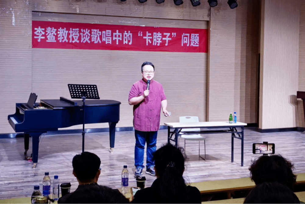 李鰲以幽默風(fēng)趣、循循善誘的方式開講,他首先闡明了什么是歌唱中的“卡脖子”問(wèn)題,繼而從發(fā)聲理念、歌唱技術(shù)、作品風(fēng)格、發(fā)音吐字、審美認(rèn)知、歌詞意境、舞臺(tái)實(shí)踐等方面逐一答疑釋惑,為全體與會(huì)者生動(dòng)講解了演唱技術(shù)、聲樂(lè)學(xué)習(xí)方法及歌唱的審美問(wèn)題。