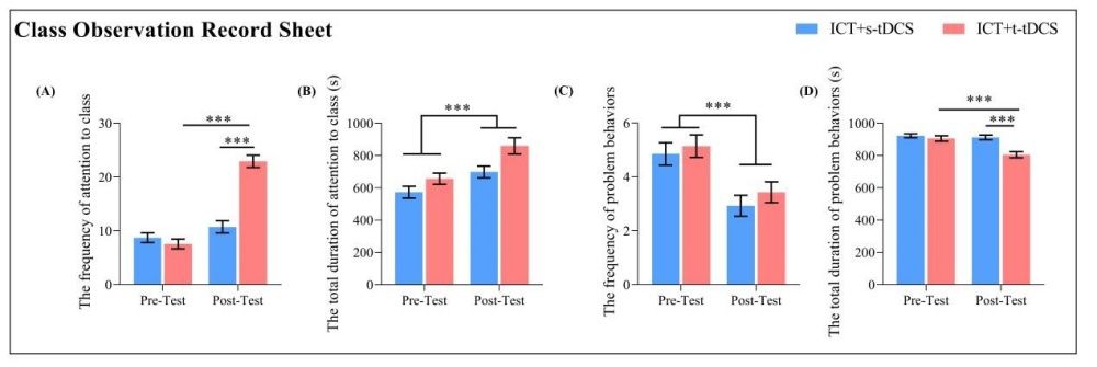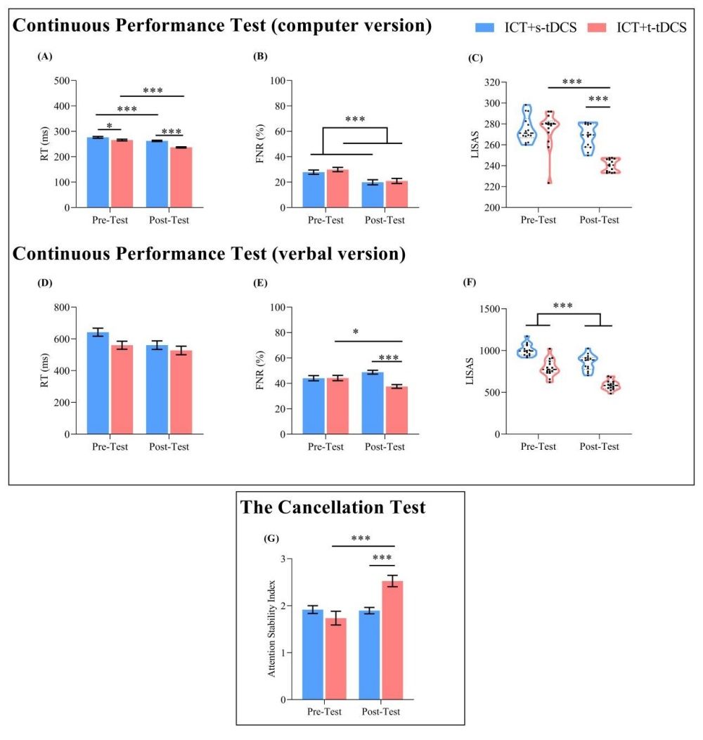 研究團(tuán)隊(duì)利用Go/No-go任務(wù)訓(xùn)練被試的反應(yīng)抑制能力。將28名孤獨(dú)癥兒童隨機(jī)分配至接受真tDCS刺激組和偽tDCS刺激組,tDCS刺激與抑制控制訓(xùn)練任務(wù)同時(shí)進(jìn)行。分別在干預(yù)前后對(duì)被試的反應(yīng)抑制能力(Dog/Monkey Task)、干擾控制能力(Day/Night Stroop Task,近遷移)、持續(xù)注意力(Continuous Performance Test和Cancellation Test,遠(yuǎn)遷移)、在課堂上和日常生活中抑制控制能力和持續(xù)注意力的表現(xiàn)進(jìn)行評(píng)估,并利用功能性近紅外技術(shù)(fNIRS)對(duì)任務(wù)態(tài)的前額葉皮層(PFC)的神經(jīng)活動(dòng)進(jìn)行了測(cè)量。結(jié)果發(fā)現(xiàn),抑制控制訓(xùn)練任務(wù)聯(lián)合真tDCS刺激組的訓(xùn)練效果和遷移效應(yīng)顯著高于偽tDCS刺激組。且訓(xùn)練效果和遷移效應(yīng)可以推廣到課堂環(huán)境中。接受抑制控制訓(xùn)練任務(wù)聯(lián)合真tDCS刺激后,觀察到雙側(cè)dLPFC和FPA中氧合血紅蛋白(HbO)濃度在一致條件下的Day/Night Stroop Task和Continuous Performance Test中存在顯著的變化。