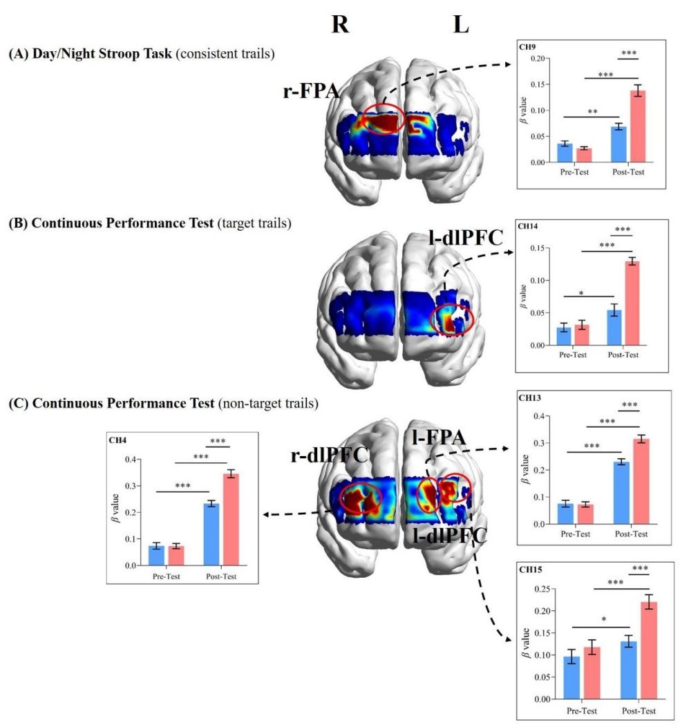 圖4 被試在前測(cè)和后測(cè)時(shí)完成電腦版Day/Night Stroop Task和Continuous Performance Test的PFC激活