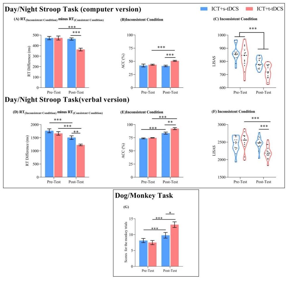 圖1 電腦版和口頭版Day/Night Stroop Task前測(cè)和后測(cè)的反應(yīng)時(shí)之差、正確率和線性綜合速度-準(zhǔn)確度評(píng)分(圖A-F);