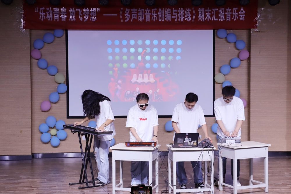 本場音樂會以說故事的方式,通過五個不同的篇章《造夢工坊》《童年的夢》《少年心懷》《詩畫人間》《逐夢未來》,帶領(lǐng)觀眾踏上了一段美妙的音樂之旅。音樂會節(jié)目形式多元,以音樂教學(xué)法、多覺聯(lián)動、思政、美育、創(chuàng)新性等元素來進行節(jié)目的設(shè)計與編排,包括融合奧爾夫音樂教學(xué)法的杯子舞、聲勢表演編創(chuàng),經(jīng)典主題旋律或主題曲的鋼琴四手聯(lián)彈、民樂四重奏、三重唱多重風格改編,融入思政元素不同主題的原創(chuàng)音樂情景短劇,知名流行歌曲及動畫主題曲改編的三聲部合唱,外加創(chuàng)新形式的電子器樂合奏以及動畫鋼琴即興演奏配樂等。此次音樂會有別于傳統(tǒng)音樂會的模式,摒棄主持人的角色,改由許多采訪、幽默短視頻拍攝和多媒體的穿插串聯(lián)全場,讓音樂會富有趣味性和創(chuàng)新性。音樂會從策劃、節(jié)目設(shè)計、音樂創(chuàng)作、排練、調(diào)整到幕后,全部工作均由研究生團隊自主完成,充分展示了我校音樂碩士研究生豐富的創(chuàng)意思維、高質(zhì)量的音樂素養(yǎng)能力與團隊協(xié)作能力。