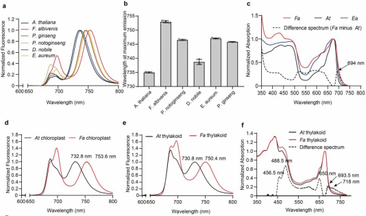 圖1:與擬南芥等高等植物相比,網(wǎng)紋草(Fittonia albivenis)具有紅移的吸收光譜和熒光光譜