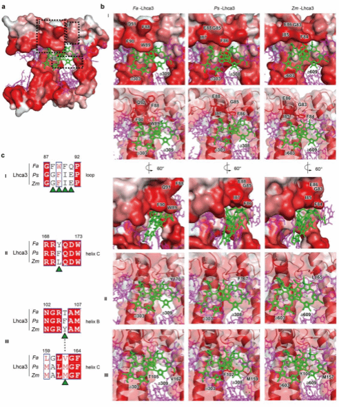 圖3:Fa PSI-LHCI捕光天線Lhca3結構與其它被子植物Lhca3結構的對比推測導致葉綠素分子光譜紅移的結構基礎