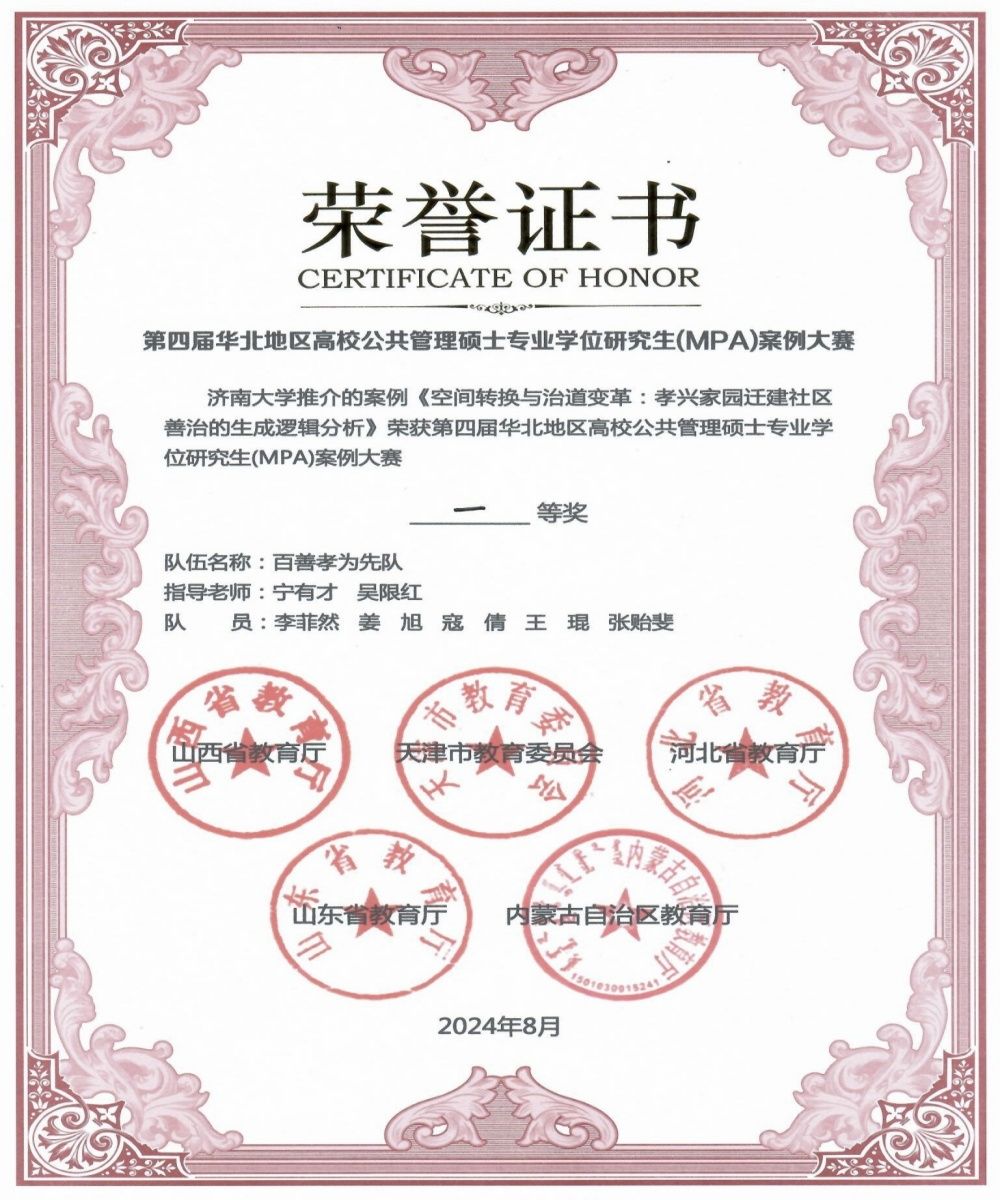本次大賽共有來自山西、天津、山東、河北、內蒙古五個?。ㄊ?、自治區(qū))高等院校的六十支隊伍參加。由我校政法學院教師寧有才、吳限紅指導,公共管理學2023級研究生李菲然(隊長)、公共管理(MPA)2022級研究生姜旭、王琨、寇倩、張貽斐組成的“百善孝為先”隊代表濟南大學參賽,并提交參賽案例《空間轉換與治道變革:孝興家園遷建社區(qū)善治的生成邏輯分析》。