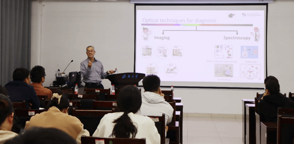 Dror Fixler教授以“納米光子學(xué)及其生物應(yīng)用”為題做了精彩的學(xué)術(shù)報(bào)告。他闡述了用納米光子學(xué)工具重建參與介質(zhì)光學(xué)性質(zhì)的理論和實(shí)踐模型,介紹了Dror Fixler實(shí)驗(yàn)室使用擴(kuò)散反射剖面、添加納米顆粒作為對(duì)比劑、全散射剖面及其等徑長(zhǎng)點(diǎn)或迭代相位多次測(cè)量重建技術(shù)來探測(cè)組織特性,利用熒光壽命和熒光各向異性等光學(xué)參數(shù)的變化來探測(cè)多種生物環(huán)境,講解了金納米顆粒(球體和棒狀)、有機(jī)納米顆粒以及類組織體模等化學(xué)和生物材料的設(shè)計(jì)制備,以及在癌癥和動(dòng)脈硬化等疾病診斷、不同生理參數(shù)、可視化酶活性和早期細(xì)胞突變檢測(cè)等各方面的應(yīng)用。報(bào)告深入淺出,使師生們獲益良多。報(bào)告會(huì)后,F(xiàn)ixler教授與參會(huì)師生進(jìn)行了深入交流,并耐心解答了大家的提問。